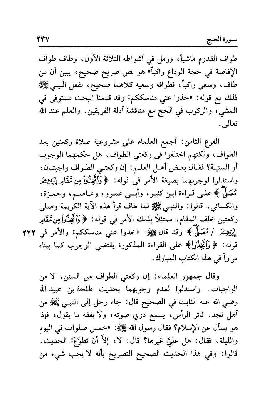الفرع الثامن: أجمع العلماء على مشروعية صلاة ركعتين بعد الطواف، ولكنهم اختلفوا في ركعتي الطواف، هل حكمهما الوجوب أو السنية؟ فقال بعض أهل العلم: إن ركعتي الطواف واجبتان، واستدلوا لوجوبهما بصيغة الأمر في قوله: {وَاتَّخِذُوا مِنْ مَقَامِ إِبْرَاهِيمَ مُصَلًّى} على قراءة ابن كثير، وأبي عمرو، وعاصم، وحمزة، والكسائي، قالوا: والنبي - صلى الله عليه وسلم - لما طاف قرأ هذه الآية الكريمة وصلى ركعتين خلف المقام، ممتثلًا بذلك الأمر في قوله: {وَاتَّخِذُوا مِنْ مَقَامِ إِبْرَاهِيمَ مُصَلًّى} وقد قال - صلى الله عليه وسلم - : "خذوا عني مناسككم" والأمر في قوله: {وَاتَّخِذُوا} على القراءة المذكورة يقتضي الوجوب كما بيناه مرارًا في هذا الكتاب المبارك.