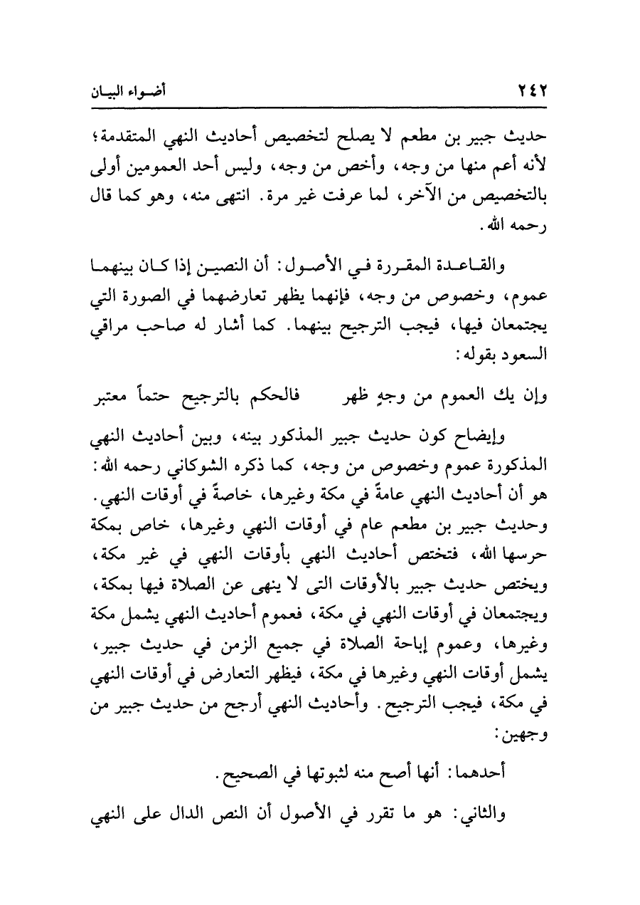 وإيضاح كون حديث جبير المذكور بينه، وبين أحاديث النهي المذكورة عموم وخصوص من وجه، كما ذكره الشوكاني رحمه الله: هو أن أحاديث النهي عامةً في مكة وغيرها، خاصةً في أوقات النهي. وحديث جبير بن مطعم عام في أوقات النهي وغيرها، خاص بمكة حرسها الله، فتختص أحاديث النهي بأوقات النهي في غير مكة، ويختص حديث جبير بالأوقات التي لا ينهى عن الصلاة فيها بمكة، ويجتمعان في أوقات النهي في مكة، فعموم أحاديث النهي يشمل مكة وغيرها، وعموم إباحة الصلاة في جميع الزمن في حديث جبير، يشمل أوقات النهي وغيرها في مكة، فيظهر التعارض في أوقات النهي في مكة، فيجب الترجيح. وأحاديث النهي أرجح من حديث جبير من وجهين: