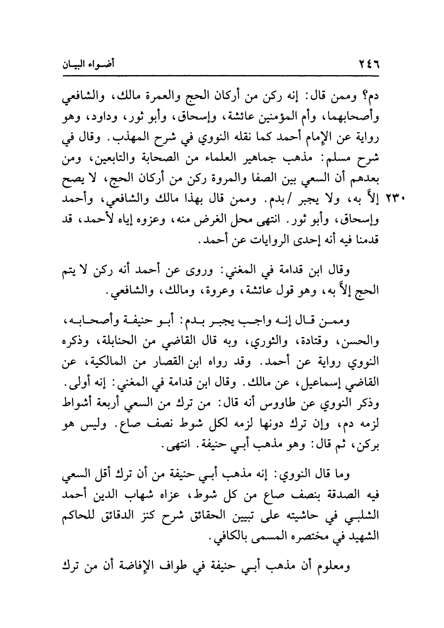دم؟ وممن قال: إنه ركن من أركان الحج والعمرة مالك، والشَّافعي وأصحابهما، وأم المؤمنين عائشة، وإسحاق، وأَبو ثور، وداود، وهو رواية عن الإِمام أحمد كما نقله النووي في شرح المهذب. وقال في شرح مسلم: مذهب جماهير العلماء من الصحابة والتابعين، ومن بعدهم أن السعي بين الصفا والمروة ركن من أركان الحج، لا يصح إلَّا به، ولا يجبر بدم. وممن قال بهذا مالك والشَّافعي، وأحمد وإسحاق، وأَبو ثور. انتهى محل الغرض منه، وعزوه إياه لأحمد، قد قدمنا فيه أنَّه إحدى الروايات عن أحمد.