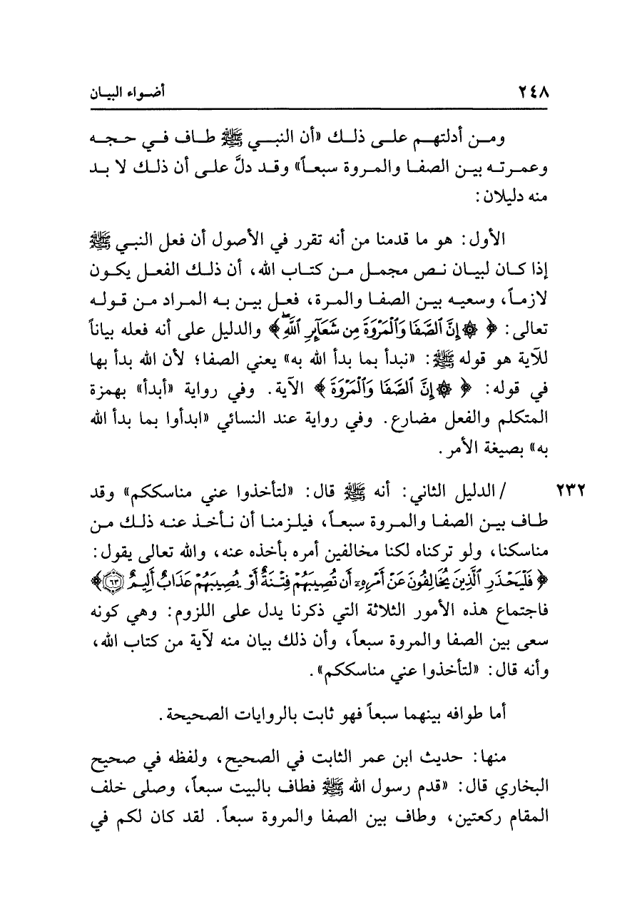 الدليل الثاني: أنه - صلى الله عليه وسلم - قال: "لتأخذوا عني مناسككم" وقد طاف بين الصفا والمروة سبعًا، فيلزمنا أن نأخذ عنه ذلك من مناسكنا، ولو تركناه لكنا مخالفين أمره بأخذه عنه، والله تعالى يقول: {فَلْيَحْذَرِ الَّذِينَ يُخَالِفُونَ عَنْ أَمْرِهِ أَنْ تُصِيبَهُمْ فِتْنَةٌ أَوْ يُصِيبَهُمْ عَذَابٌ أَلِيمٌ (٦٣)} فاجتماع هذه الأمور الثلاثة التي ذكرنا يدل على اللزوم: وهي كونه سعى بين الصفا والمروة سبعًا، وأن ذلك بيان منه لآية من كتاب الله، وأنه قال: "لتأخذوا عني مناسككم".
