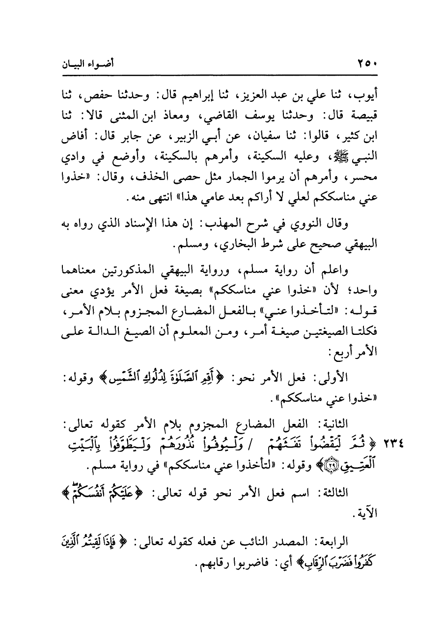 واعلم أن رواية مسلم، ورواية البيهقي المذكورتين معناهما واحد؛ لأن "خذوا عني مناسككم" بصيغة فعل الأمر يؤدي معنى قوله: "لتأخذوا عني" بالفعل المضارع المجزوم بلام الأمر، فكلتا الصيغتين صيغة أمر، ومن المعلوم أن الصيغ الدالة على الأمر أربع: