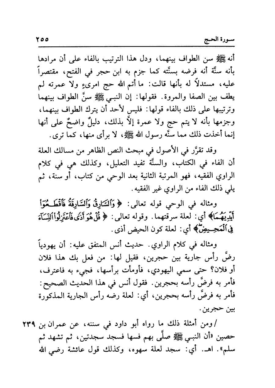 أنه - صلى الله عليه وسلم - سن الطواف بينهما، ودل هذا الترتيب بالفاء على أن مرادها بأنه سنَّة أنه فرضه بسنَّته كما جزم به ابن حجر في الفتح، مقتصرًا عليه، مستدلًا له بأنها قالت: ما أتم الله حج امرئٍ ولا عمرته لم يطف بين الصفا والمروة. فقولها: إن النبي - صلى الله عليه وسلم - سنَّ الطواف بينهما وترتيبها على ذلك بالفاء قولها: فليس لأحد أن يترك الطواف بينهما، وجزمها بأنه لا يتم حج ولا عمرة إلَّا بذلك، دليلٌ واضحٌ على أنها إنما أخذت ذلك مما سنَّه رسول الله - صلى الله عليه وسلم - ، لا برأى منها، كما ترى.
