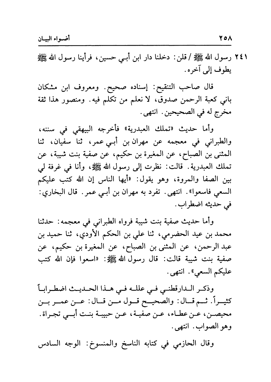 وأما حديث صفية بنت شيبة فرواه الطبراني في معجمه: حدثنا محمد بن عيد الحضرمي، ثنا علي بن الحكم الأودي، ثنا حميد بن عبد الرحمن، عن المثنى بن الصباح، عن المغيرة بن حكيم، عن صفية بنت شيبة قالت: قال رسول الله - صلى الله عليه وسلم - : "اسعوا فإن الله كتب عليكم السعي". انتهى.
