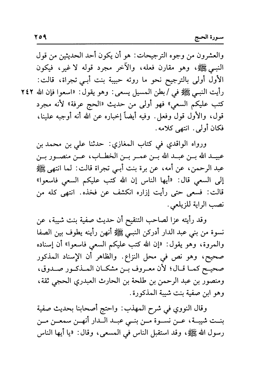 وقد رأيته عزا لصاحب التنقيح أن حديث صفية بنت شيبة، عن نسوة من بني عبد الدار أدركن النبي - صلى الله عليه وسلم - أنهن رأينه يطوف بين الصفا والمروة، وهو يقول: "إن الله كتب عليكم السعي فاسعوا" أن إسناده صحيح، وهو نص في محل النزاع. والظاهر أن الإِسناد المذكور صحيح كما قال؛ لأن معروف بن مشكان المذكور صدوق، ومنصور بن عبد الرحمن بن طلحة بن الحارث العبدري الحجي ثقة، وهو ابن صفية بنت شيبة المذكورة.