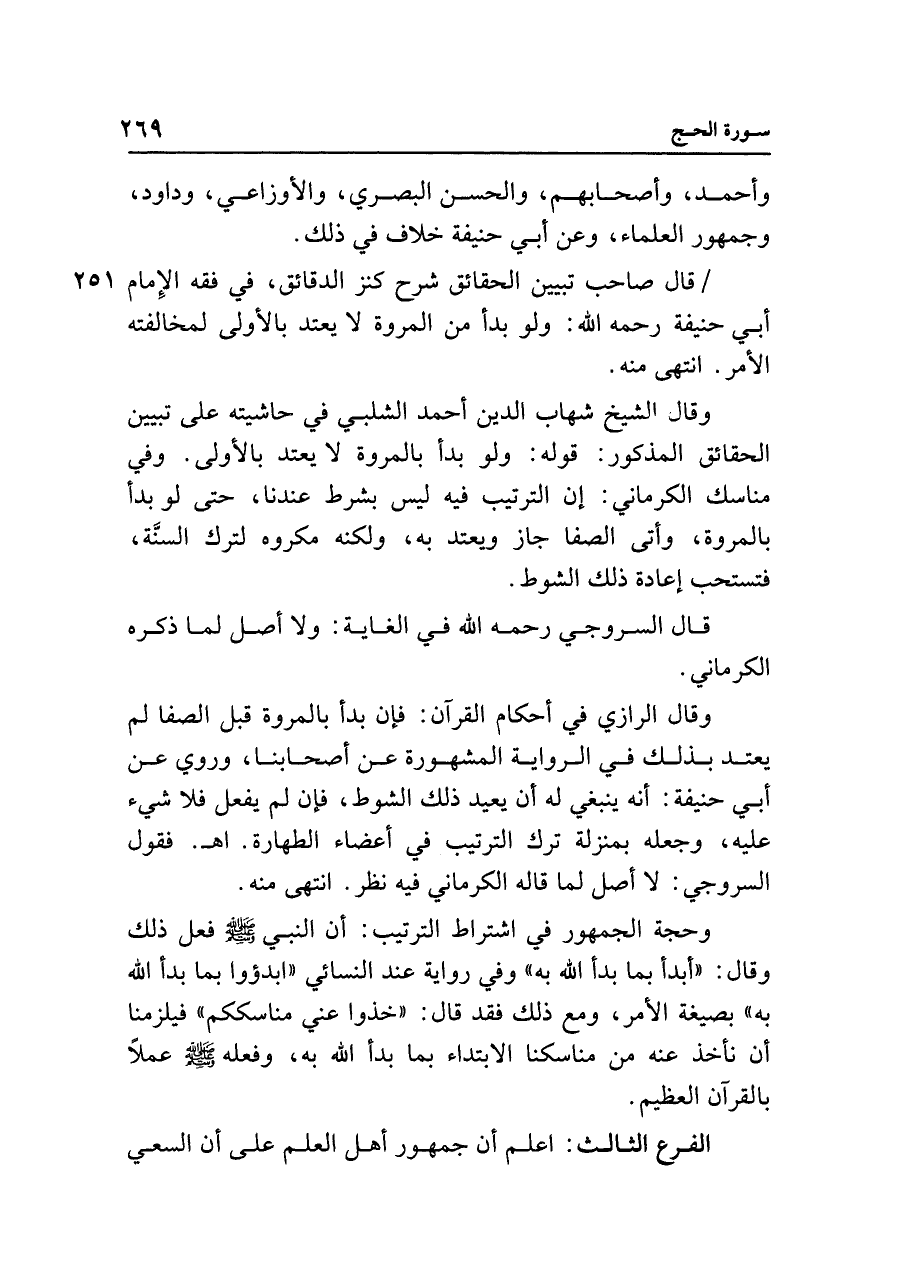 وحجة الجمهور في اشتراط الترتيب: أن النبي - صلى الله عليه وسلم - فعل ذلك وقال: "أبدأ بما بدأ الله به" وفي رواية عند النسائي "ابدؤوا بما بدأ الله به" بصيغة الأمر، ومع ذلك فقد قال: "خذوا عني مناسككم" فيلزمنا أن نأخذ عنه من مناسكنا الابتداء بما بدأ الله به، وفعله - صلى الله عليه وسلم - عملًا بالقرآن العظيم.