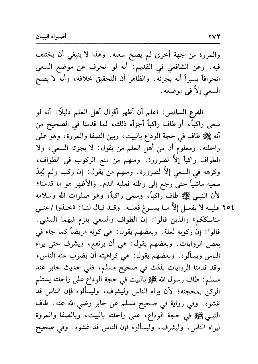 الفرع السادس: اعلم أن أظهر أقوال أهل العلم دليلًا: أنه لو سعى راكبًا، أو طاف راكبًا أجزأه ذلك، لما قدمنا في الصحيح من أنه - صلى الله عليه وسلم - طاف في حجة الوداع بالبيت، وبين الصفا والمروة، وهو على راحلته. ومعلوم أن من أهل العلم من يقول: لا يجزئه السعي، ولا الطواف راكبًا إلَّا لضرورة. ومنهم من منع الركوب في الطواف، وكرهه في السعي إلَّا لضرورة. ومنهم من يقول: إن ركب ولم يُعِدْ سعيه ماشيًا حتى رجع إلى وطنه فعليه الدم. والأظهر هو ما قدمنا؛ لأن النبي - صلى الله عليه وسلم - طاف راكبًا، وسعى راكبًا، وهو صلوات الله وسلامه عليه لا يفعل إلَّا ما يسوغ فعله. وقد قال لنا: "خذوا عني مناسككم" والذين قالوا: إن الطواف والسعي يلزم فيهما المشي. قالوا: إن ركوبه لعلة. وبعضهم يقول: هي كونه مريضًا كما جاء في بعض الروايات. وبعضهم يقول: هي أن يرتفع، ويشرف حتى يراه الناس ويسألوه. وبعضهم يقول: هي كراهيته أن يضرب عنه الناس، وقد قدمنا الروايات بذلك في صحيح مسلم، ففي حديث جابر عند مسلم: طاف رسول الله - صلى الله عليه وسلم - بالبيت في حجة الوداع على راحلته يستلم الركن بمحجنه؛ لأن يراه الناس وليشرف، وليسألوه فإن الناس قد غشوه. وفي رواية في صحيح مسلم عن جابر رضي الله عنه: طاف النبي - صلى الله عليه وسلم - في حجة الوداع، على راحلته بالبيت، وبالصفا والمروة ليراه الناس، وليشرف، وليسألوه فإن الناس قد غشوه. وفي صحيح