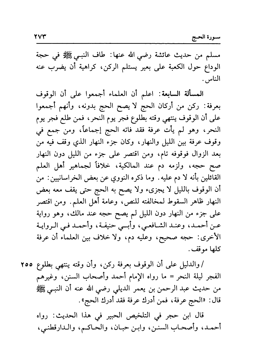 المسألة السابعة: اعلم أن العلماء أجمعوا على أن الوقوف بعرفة: ركن من أركان الحج لا يصح الحج بدونه، وأنهم أجمعوا على أن الوقوف ينتهي وقته بطلوع فجر يوم النحر، فمن طلع فجر يوم النحر، وهولم يأت عرفة فقد فاته الحج إجماعًا، ومن جمع في وقوف عرفة بين الليل والنهار، وكان جزء النهار الذي وقف فيه من بعد الزوال فوقوفه تام، ومن اقتصر على جزء من الليل دون النهار صح حجه، ولزمه دم عند المالكية، خلافًا لجماهير أهل العلم القائلين بأنه لا دم عليه. وما ذكره النووي عن بعض الخراسانيين: من أن الوقوف بالليل لا يجزئ ولا يصح به الحج حتى يقف معه بعض النهار ظاهر السقوط لمخالفته للنص، وعامة أهل العلم. ومن اقتصر على جزء من النهار دون الليل لم يصح حجه عند مالك، وهو رواية عن أحمد، وعند الشافعي، وأبي حنيفة، وأحمد في الرواية الأخرى: حجه صحيح، وعليه دم، ولا خلاف بين العلماء أن عرفة كلها موقف.