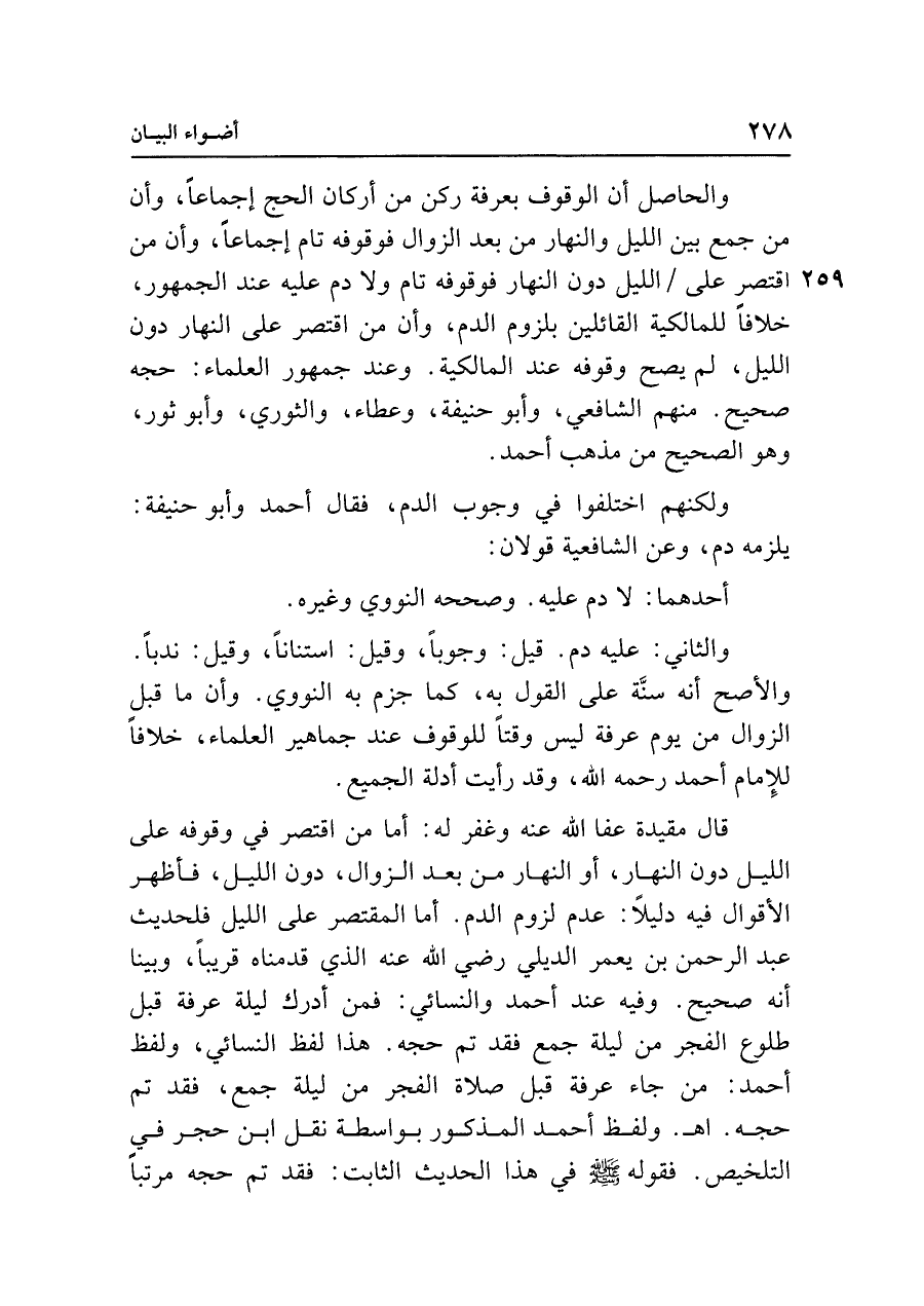 قال مقيدة عفا الله عنه وغفر له: أما من اقتصر في وقوفه على الليل دون النهار، أو النهار من بعد الزوال، دون الليل، فأظهر الأقوال فيه دليلًا: عدم لزوم الدم. أما المقتصر على الليل فلحديث عبد الرحمن بن يعمر الديلي رضي الله عنه الذي قدمناه قريبًا، وبينا أنه صحيح. وفيه عند أحمد والنسائي: فمن أدرك ليلة عرفة قبل طلوع الفجر من ليلة جمع فقد تم حجه. هذا لفظ النسائي، ولفظ أحمد: من جاء عرفة قبل صلاة الفجر من ليلة جمع، فقد تم حجه. اهـ. ولفظ أحمد المذكور بواسطة نقل ابن حجر في التلخيص. فقوله - صلى الله عليه وسلم - في هذا الحديث الثابت: فقد تم حجه مرتبًا