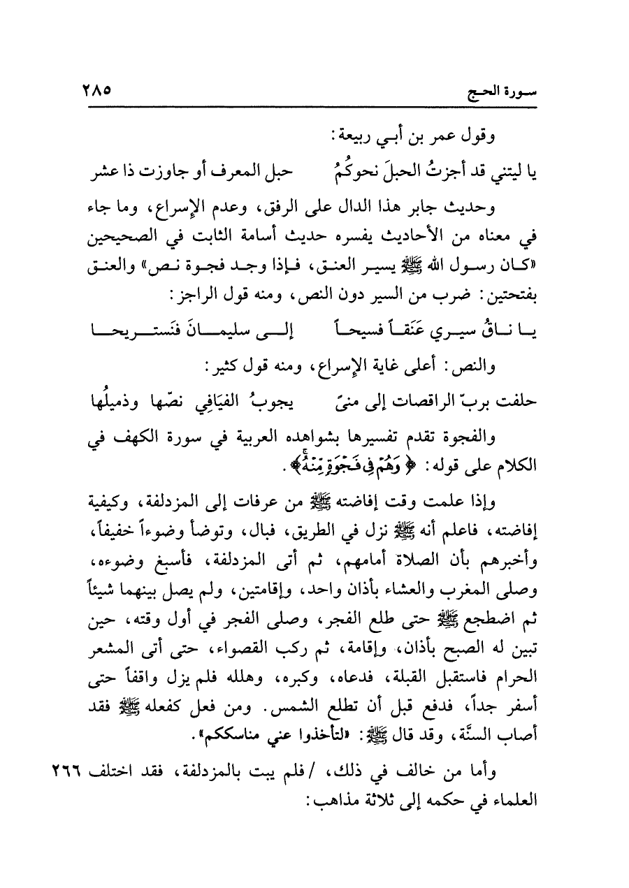 وحديث جابر هذا الدال على الرفق، وعدم الإِسراع، وما جاء في معناه من الأحاديث يفسره حديث أسامة الثابت في الصحيحين "كان رسول الله - صلى الله عليه وسلم - يسير العنق، فإذا وجد فجوة نص" والعنق بفتحتين: ضرب من السير دون النص، ومنه قول الراجز: