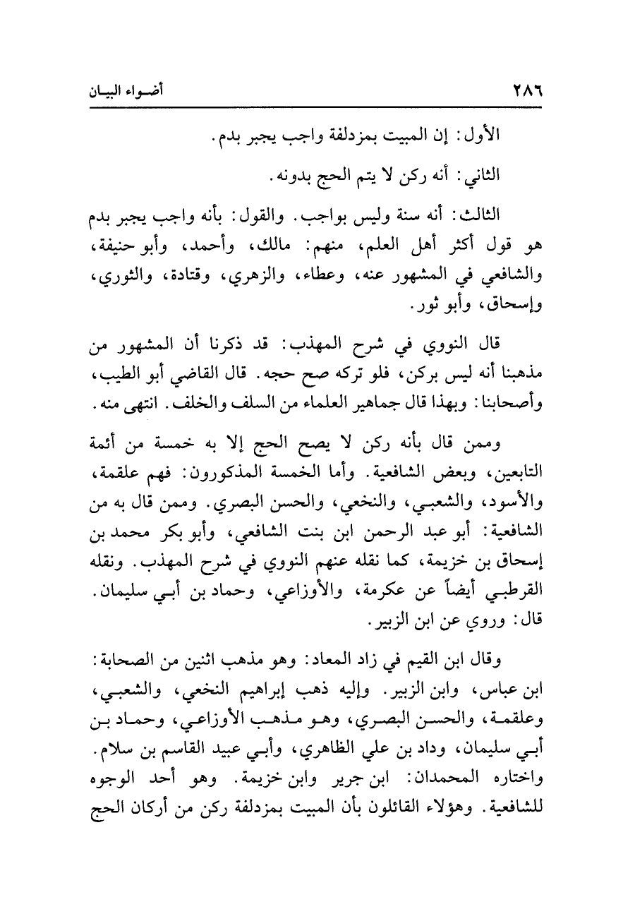 وقال ابن القيم في زاد المعاد: وهو مذهب اثنين من الصحابة: ابن عباس، وابن الزبير. وإليه ذهب إبراهيم النخعي، والشعبي، وعلقمة، والحسن البصري، وهو مذهب الأوزاعي، وحماد بن أبي سليمان، وداد بن علي الظاهري، وأبي عبيد القاسم بن سلام. واختاره المحمدان: ابن جرير وابن خزيمة. وهو أحد الوجوه للشافعية. وهؤلاء القائلون بأن المبيت بمزدلفة ركن من أركان الحج