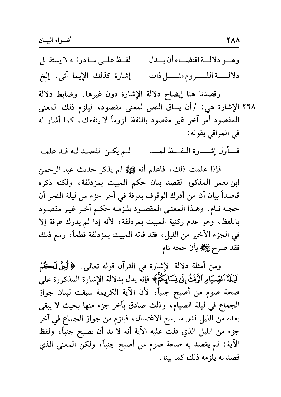 ومن أمثلة دلالة الإِشارة في القرآن قوله تعالى: {أُحِلَّ لَكُمْ لَيْلَةَ الصِّيَامِ الرَّفَثُ إِلَى نِسَائِكُمْ} فإنه يدل بدلالة الإِشارة المذكورة على صحة صوم من أصبح جنبًا؛ لأن الآية الكريمة سيقت لبيان جواز الجماع في ليلة الصيام، وذلك صادق بآخر جزء منها بحيث لا يبقى بعده من الليل قدر ما يسع الاغتسال، فيلزم من جواز الجماع في آخر جزء من الليل الذي دلت عليه الآية أنه لا بد أن يصبح جنبًا، ولفظ الآية: لم يقصد به صحة صوم من أصبح جنبًا، ولكن المعنى الذي قصد به يلزمه ذلك كما بينا.