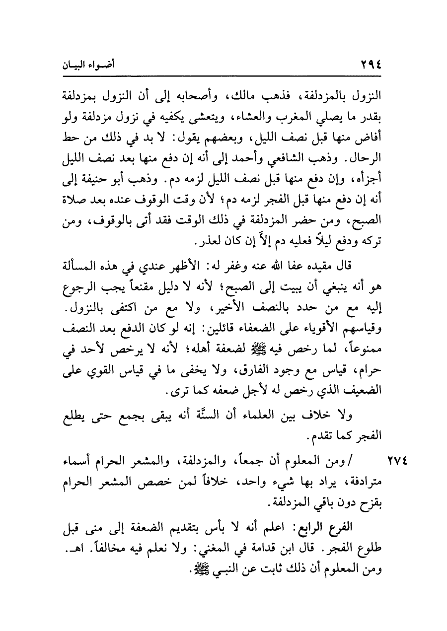النزول بالمزدلفة، فذهب مالك، وأصحابه إلى أن النزول بمزدلفة بقدر ما يصلي المغرب والعشاء، ويتعشى يكفيه في نزول مزدلفة ولو أفاض منها قبل نصف الليل، وبعضهم يقول: لا بد في ذلك من حط الرحال. وذهب الشافعي وأحمد إلى أنه إن دفع منها بعد نصف الليل أجزأه، وإن دفع منها قبل نصف الليل لزمه دم. وذهب أبو حنيفة إلى أنه إن دفع منها قبل الفجر لزمه دم؛ لأن وقت الوقوف عنده بعد صلاة الصبح، ومن حضر المزدلفة في ذلك الوقت فقد أتى بالوقوف، ومن تركه ودفع ليلًا فعليه دم إلَّا إن كان لعذر.