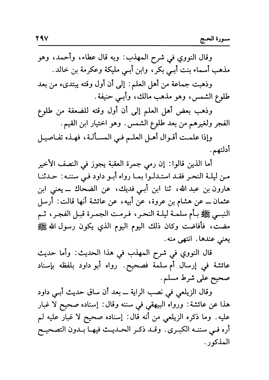 أما الذين قالوا: إن رمي جمرة العقبة يجوز في النصف الأخير من ليلة النحر فقد استدلوا بما رواه أبو داود في سننه: حدثنا هارون بن عبد الله، ثنا ابن أبي فديك، عن الضحاك - يعني ابن عثمان - عن هشام بن عروة، عن أبيه، عن عائشة أنها قالت: أرسل النبي - صلى الله عليه وسلم - بأم سلمة ليلة النحر، فرمت الجمرة قبل الفجر، ثم مضت، فأفاضت وكان ذلك اليوم اليوم الذي يكون رسول الله - صلى الله عليه وسلم - يعني عندها. انتهى منه.