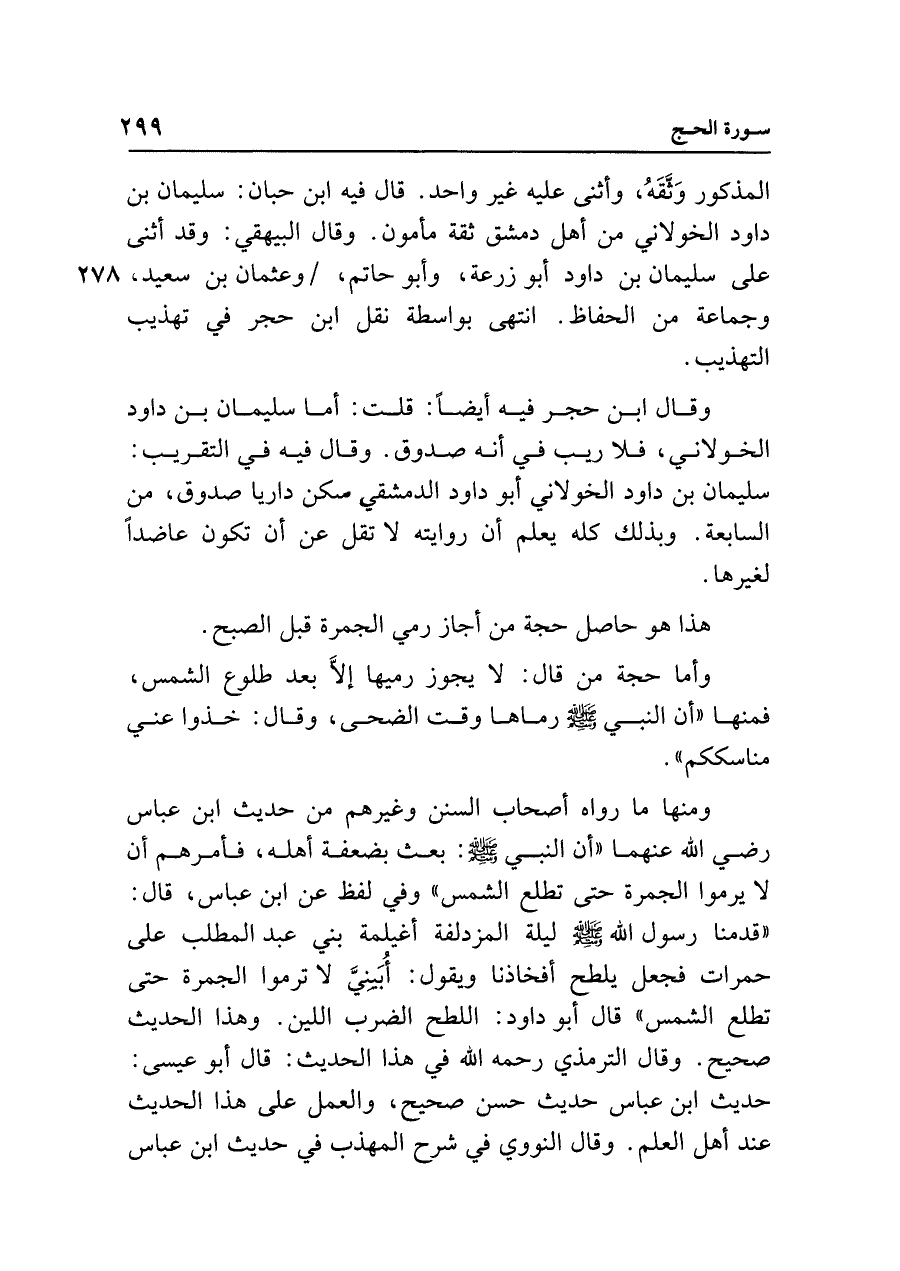 ومنها ما رواه أصحاب السنن وغيرهم من حديث ابن عباس رضي الله عنهما "أن النبي - صلى الله عليه وسلم - : بعث بضعفة أهله، فأمرهم أن لا يرموا الجمرة حتى تطلع الشمس" وفي لفظ عن ابن عباس، قال: "قدمنا رسول الله - صلى الله عليه وسلم - ليلة المزدلفة أغيلمة بني عبد المطلب على حمرات فجعل يلطح أفخاذنا ويقول: أُبَيِنيَّ لا ترموا الجمرة حتى تطلع الشمس" قال أبو داود: اللطح الضرب اللين. وهذا الحديث صحيح. وقال الترمذي رحمه الله في هذا الحديث: قال أبو عيسى: حديث ابن عباس حديث حسن صحيح، والعمل على هذا الحديث عند أهل العلم. وقال النووي في شرح المهذب في حديث ابن عباس