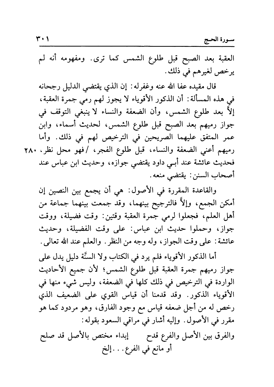 قال مقيده عفا الله عنه وغفر له: إن الذي يقتضي الدليل رجحانه في هذه المسألة: أن الذكور الأقوياء لا يجوز لهم رمي جمرة العقبة، إلَّا بعد طلوع الشمس، وأن الضعفة والنساء لا ينبغي التوقف في جواز رميهم بعد الصبح قبل طلوع الشمس، لحديث أسماء، وابن عمر المتفق عليهما الصريحين في الترخيص لهم في ذلك. وأما رميهم أعني الضعفة والنساء، قبل طلوع الفجر، فهو محل نظر، فحديث عائشة عند أبي داود يقتضي جوازه، وحديث ابن عباس عند أصحاب السنن: يقتضي منعه.