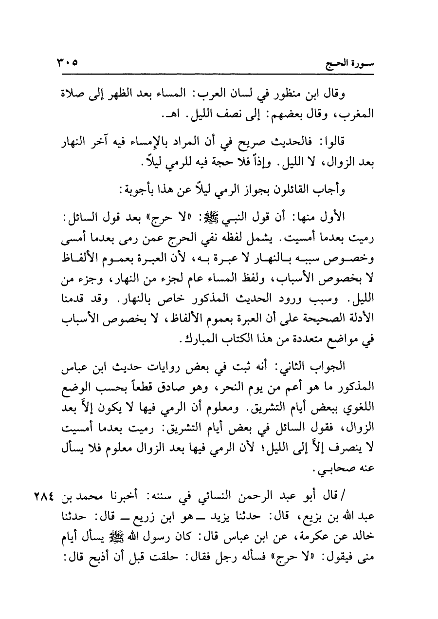 الجواب الثاني: أنه ثبت في بعض روايات حديث ابن عباس المذكور ما هو أعم من يوم النحر، وهو صادق قطعًا بحسب الوضع اللغوي ببعض أيام التشريق. ومعلوم أن الرمي فيها لا يكون إلَّا بعد الزوال، فقول السائل في بعض أيام التشريق: رميت بعدما أمسيت لا ينصرف إلَّا إلى الليل؛ لأن الرمي فيها بعد الزوال معلوم فلا يسأل عنه صحابي.