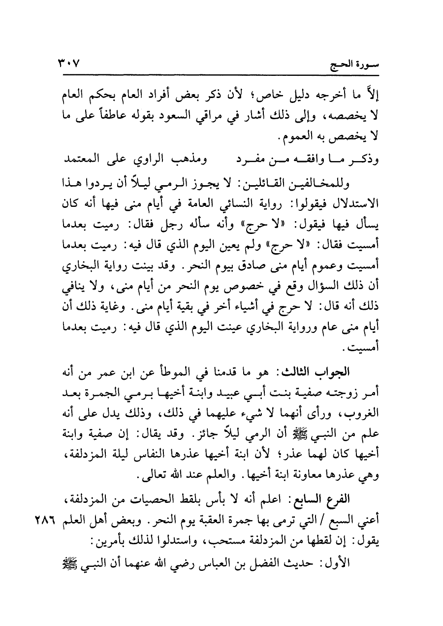 وللمخالفين القائلين: لا يجوز الرمي ليلًا أن يردوا هذا الاستدلال فيقولوا: رواية النسائي العامة في أيام منى فيها أنه كان يسأل فيها فيقول: "لا حرج" وأنه سأله رجل فقال: رميت بعدما أمسيت فقال: "لا حرج" ولم يعين اليوم الذي قال فيه: رميت بعدما أمسيت وعموم أيام منى صادق بيوم النحر. وقد بينت رواية البخاري أن ذلك السؤال وقع في خصوص يوم النحر من أيام منى، ولا ينافي ذلك أنه قال: لا حرج في أشياء أخر في بقية أيام منى. وغاية ذلك أن أيام منى عام ورواية البخاري عينت اليوم الذي قال فيه: رميت بعدما أمسيت.