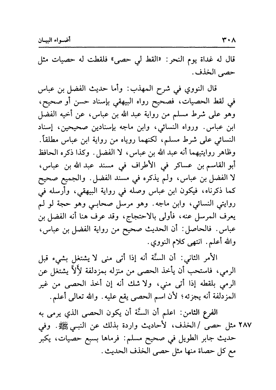 قال النووي في شرح المهذب: وأما حديث الفضل بن عباس في لقط الحصيات، فصحيح رواه البيهقي بإسناد حسن أو صحيح، وهو على شرط مسلم من رواية عبد الله بن عباس، عن أخيه الفضل بن عباس. ورواه النسائي، وابن ماجه بإسنادين صحيحين، إسناد النسائي على شرط مسلم، لكنهما روياه من رواية ابن عباس مطلقًا. وظاهر روايتيهما أنه عبد الله بن عباس، لا الفضل. وكذا ذكره الحافظ أبو القاسم بن عساكر في الأطراف في مسند عبد الله بن عباس، لا الفضل بن عباس، ولم يذكره في مسند الفضل. والجميع صحيح كما ذكرناه، فيكون ابن عباس وصله في رواية البيهقي، وأرسله في روايتي النسائي، وابن ماجه. وهو مرسل صحابي وهو حجة لو لم يعرف المرسل عنه، فأولى بالاحتجاج، وقد عرف هنا أنه الفضل بن عباس. فالحاصل: أن الحديث صحيح من رواية الفضل بن عباس، والله أعلم. انتهى كلام النووي.