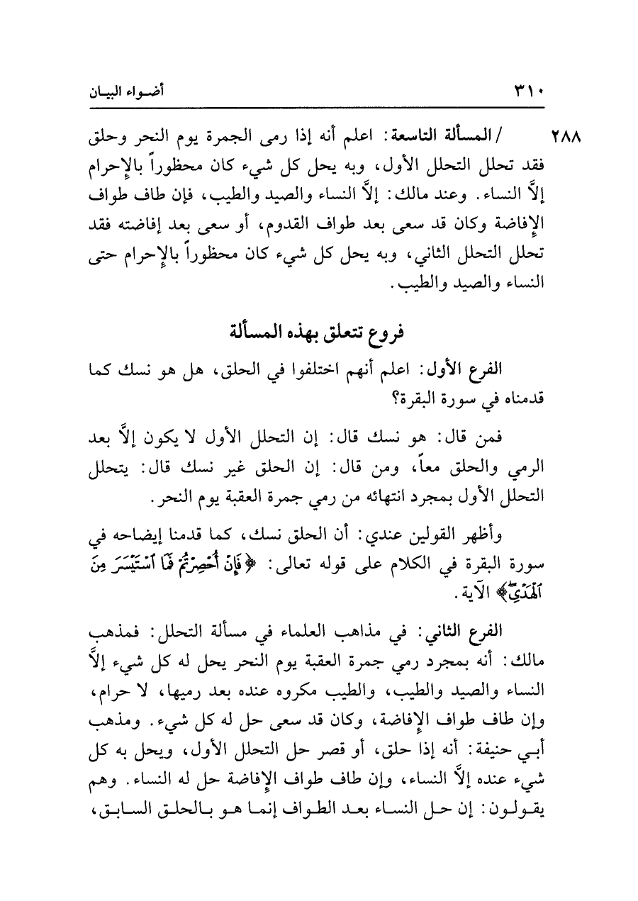 المسألة التاسعة: اعلم أنه إذا رمى الجمرة يوم النحر وحلق فقد تحلل التحلل الأول، وبه يحل كل شيء كان محظورًا بالإِحرام إلَّا النساء. وعند مالك: إلَّا النساء والصيد والطيب، فإن طاف طواف الإِفاضة وكان قد سعى بعد طواف القدوم، أو سعى بعد إفاضته فقد تحلل التحلل الثاني، وبه يحل كل شيء كان محظورًا بالإِحرام حتى النساء والصيد والطيب.