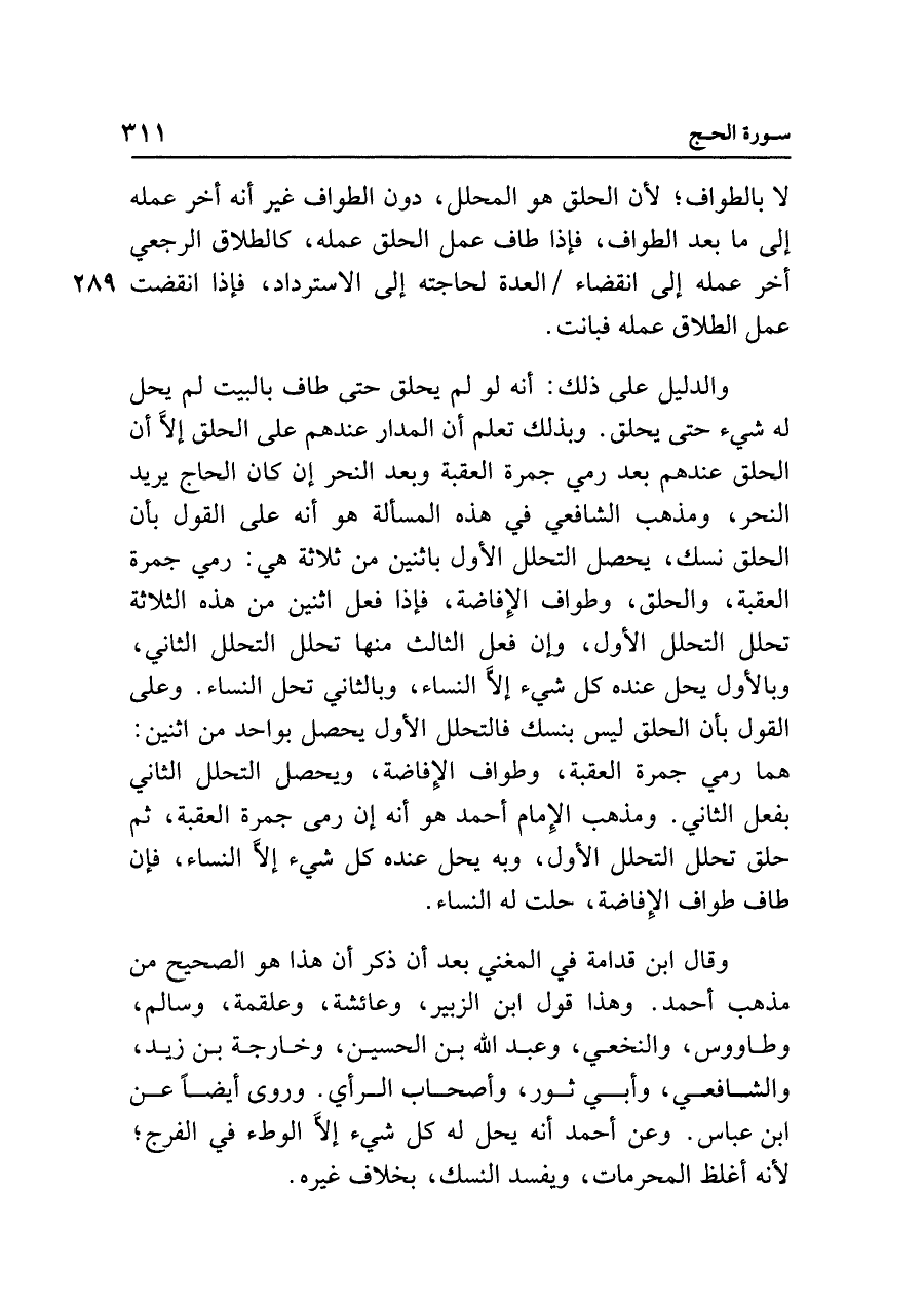 والدليل على ذلك: أنه لو لم يحلق حتى طاف بالبيت لم يحل له شيء حتى يحلق. وبذلك تعلم أن المدار عندهم على الحلق إلَّا أن الحلق عندهم بعد رمي جمرة العقبة وبعد النحر إن كان الحاج يريد النحر، ومذهب الشافعي في هذه المسألة هو أنه على القول بأن الحلق نسك، يحصل التحلل الأول باثنين من ثلاثة هي: رمي جمرة العقبة، والحلق، وطواف الإِفاضة، فإذا فعل اثنين من هذه الثلاثة تحلل التحلل الأول، وإن فعل الثالث منها تحلل التحلل الثاني، وبالأول يحل عنده كل شيء إلَّا النساء، وبالثاني تحل النساء. وعلى القول بأن الحلق ليس بنسك فالتحلل الأول يحصل بواحد من اثنين: هما رمي جمرة العقبة، وطواف الإِفاضة، ويحصل التحلل الثاني بفعل الثاني. ومذهب الإِمام أحمد هو أنه إن رمى جمرة العقبة، ثم حلق تحلل التحلل الأول، وبه يحل عنده كل شيء إلَّا النساء، فإن طاف طواف الإِفاضة، حلت له النساء.