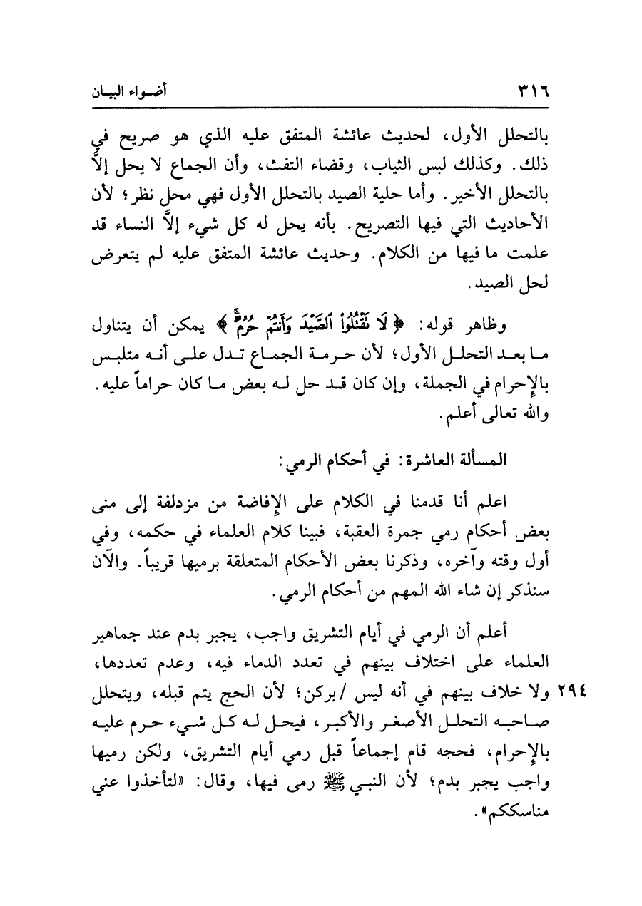 بالتحلل الأول، لحديث عائشة المتفق عليه الذي هو صريح في ذلك. وكذلك لبس الثياب، وقضاء التفث، وأن الجماع لا يحل إلَّا بالتحلل الأخير. وأما حلية الصيد بالتحلل الأول فهي محل نظر؛ لأن الأحاديث التي فيها التصريح. بأنه يحل له كل شيء إلَّا النساء قد علمت ما فيها من الكلام. وحديث عائشة المتفق عليه لم يتعرض لحل الصيد.