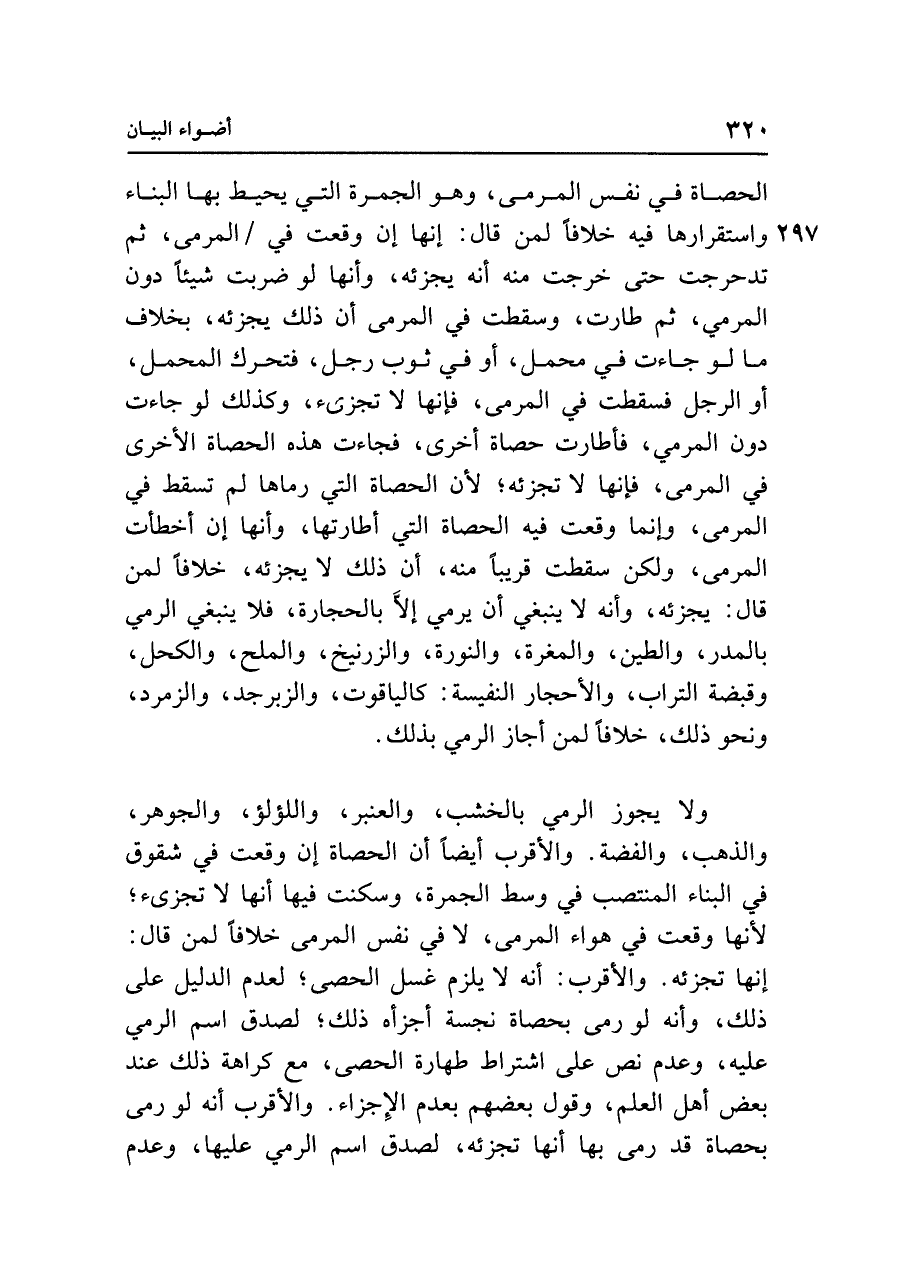 ولا يجوز الرمي بالخشب، والعنبر، واللؤلؤ، والجوهر، والذهب، والفضة. والأقرب أيضًا أن الحصاة إن وقعت في شقوق في البناء المنتصب في وسط الجمرة، وسكنت فيها أنها لا تجزئ؛ لأنها وقعت في هواء المرمى، لا في نفس المرمى خلافًا لمن قال: إنها تجزئه. والأقرب: أنه لا يلزم غسل الحصى؛ لعدم الدليل على ذلك، وأنه لو رمى بحصاة نجسة أجزأه ذلك؛ لصدق اسم الرمي عليه، وعدم نص على اشتراط طهارة الحصى، مع كراهة ذلك عند بعض أهل العلم، وقول بعضهم بعدم الإِجزاء. والأقرب أنه لو رمى بحصاة قد رمى بها أنها تجزئه، لصدق اسم الرمي عليها، وعدم