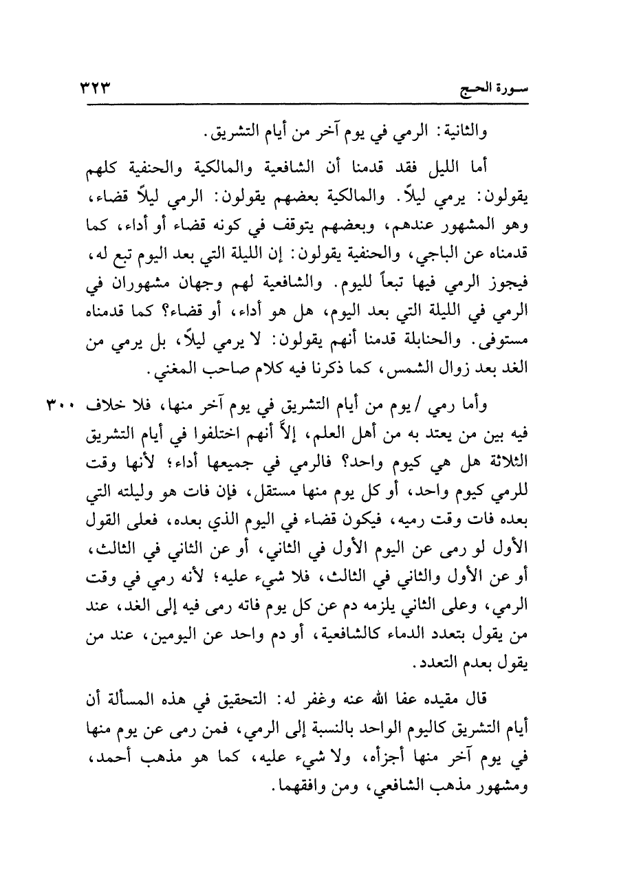 أما الليل فقد قدمنا أن الشافعية والمالكية والحنفية كلهم يقولون: يرمي ليلًا. والمالكية بعضهم يقولون: الرمي ليلًا قضاء، وهو المشهور عندهم، وبعضهم يتوقف في كونه قضاء أو أداء، كما قدمناه عن الباجي، والحنفية يقولون: إن الليلة التي بعد اليوم تبع له، فيجوز الرمي فيها تبعًا لليوم. والشافعية لهم وجهان مشهوران في الرمي في الليلة التي بعد اليوم، هل هو أداء، أو قضاء؟ كما قدمناه مستوفى. والحنابلة قدمنا أنهم يقولون: لا يرمي ليلًا، بل يرمي من الغد بعد زوال الشمس، كما ذكرنا فيه كلام صاحب المغني.