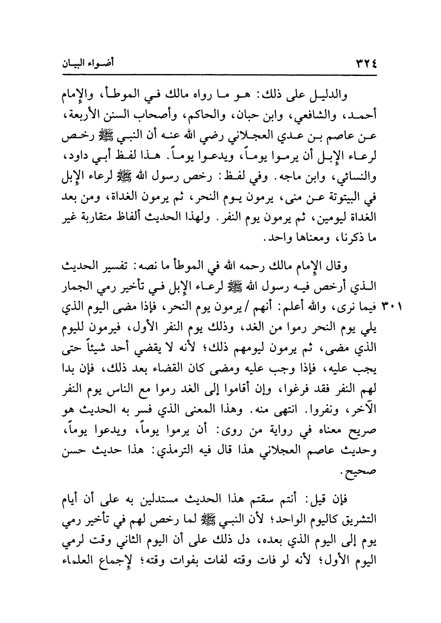 وقال الإِمام مالك رحمه الله في الموطأ ما نصه: تفسير الحديث الذي أرخص فيه رسول الله - صلى الله عليه وسلم - لرعاء الإِبل في تأخير رمي الجمار فيما نرى، والله أعلم: أنهم يرمون يوم النحر، فإذا مضى اليوم الذي يلي يوم النحر رموا من الغد، وذلك يوم النفر الأول، فيرمون لليوم الذي مضى، ثم يرمون ليومهم ذلك؛ لأنه لا يقضي أحد شيئًا حتى يجب عليه، فإذا وجب عليه ومضى كان القضاء بعد ذلك، فإن بدا لهم النفر فقد فرغوا، وإن أقاموا إلى الغد رموا مع الناس يوم النفر الآخر، ونفروا. انتهى منه. وهذا المعنى الذي فسر به الحديث هو صريح معناه في رواية من روى: أن يرموا يومًا، ويدعوا يومًا، وحديث عاصم العجلاني هذا قال فيه الترمذي: هذا حديث حسن صحيح.