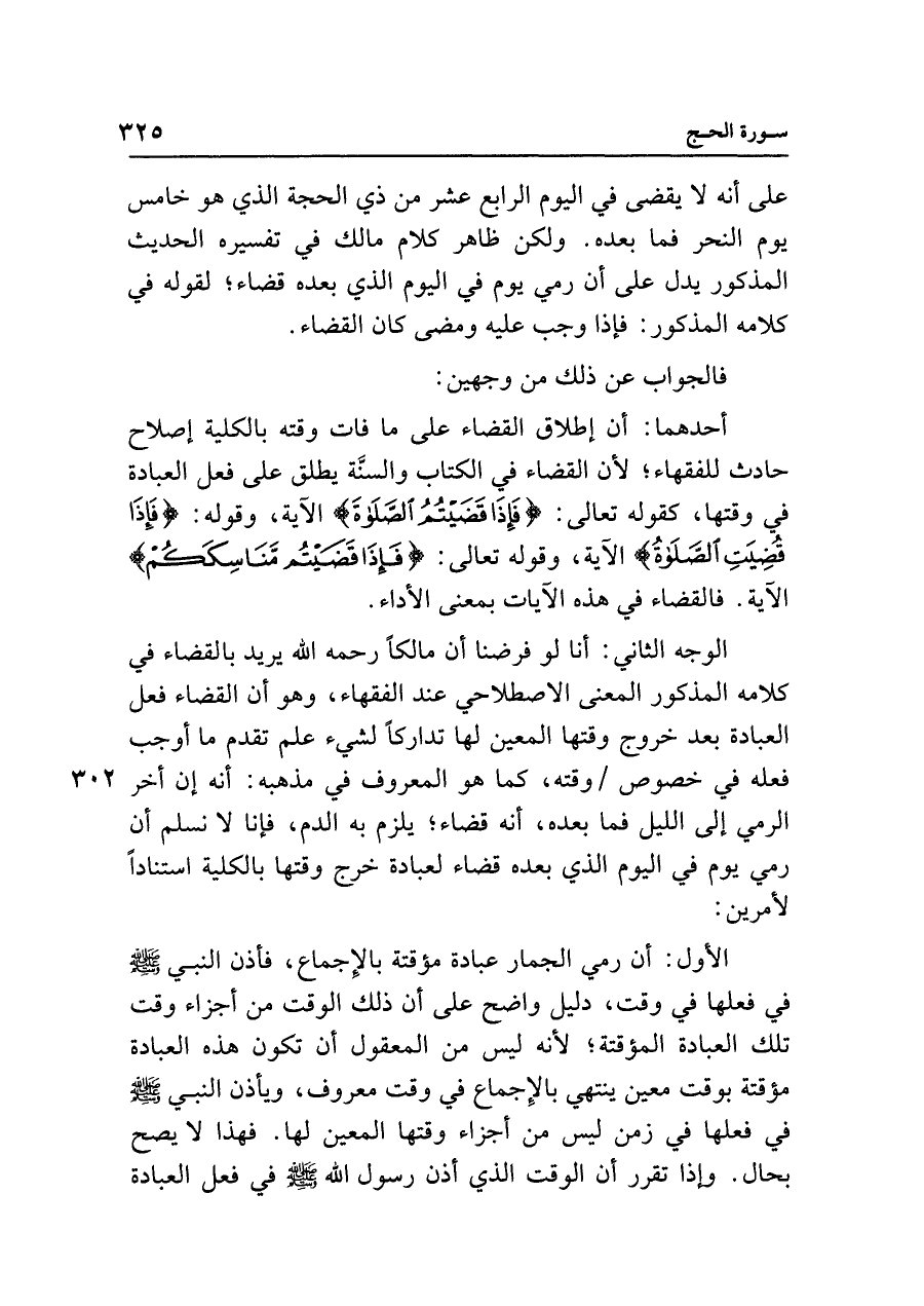 الوجه الثاني: أنا لو فرضنا أن مالكًا رحمه الله يريد بالقضاء في كلامه المذكور المعنى الاصطلاحي عند الفقهاء، وهو أن القضاء فعل العبادة بعد خروج وقتها المعين لها تداركًا لشيء علم تقدم ما أوجب فعله في خصوص وقته، كما هو المعروف في مذهبه: أنه إن أخر الرمي إلى الليل فما بعده، أنه قضاء؛ يلزم به الدم، فإنا لا نسلم أن رمي يوم في اليوم الذي بعده قضاء لعبادة خرج وقتها بالكلية استنادًا لأمرين: