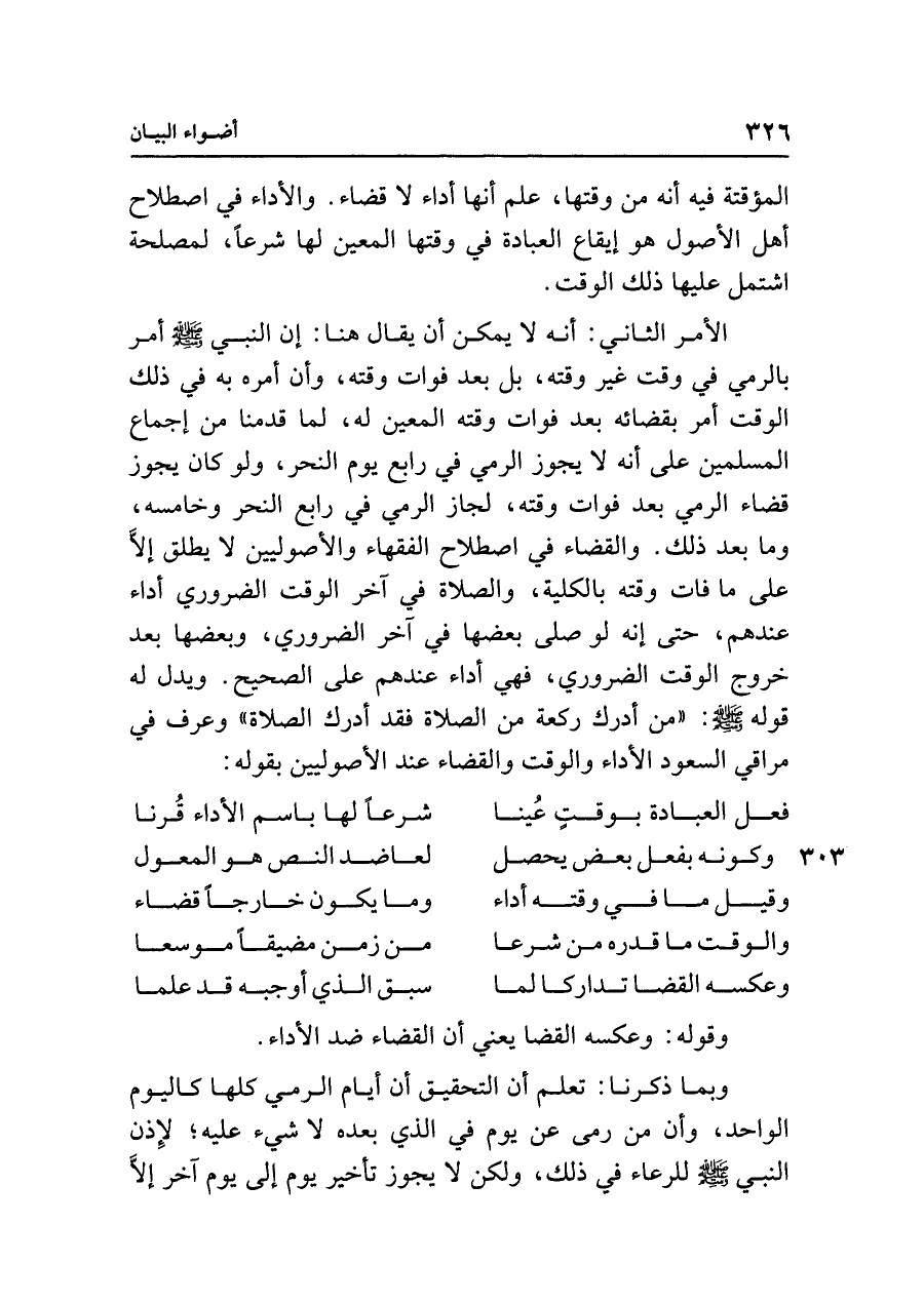 الأمر الثاني: أنه لا يمكن أن يقال هنا: إن النبي - صلى الله عليه وسلم - أمر بالرمي في وقت غير وقته، بل بعد فوات وقته، وأن أمره به في ذلك الوقت أمر بقضائه بعد فوات وقته المعين له، لما قدمنا من إجماع المسلمين على أنه لا يجوز الرمي في رابع يوم النحر، ولو كان يجوز قضاء الرمي بعد فوات وقته، لجاز الرمي في رابع النحر وخامسه، وما بعد ذلك. والقضاء في اصطلاح الفقهاء والأصوليين لا يطلق إلَّا على ما فات وقته بالكلية، والصلاة في آخر الوقت الضروري أداء عندهم، حتى إنه لو صلى بعضها في آخر الضروري، وبعضها بعد خروج الوقت الضروري، فهي أداء عندهم على الصحيح. ويدل له قوله - صلى الله عليه وسلم - : "من أدرك ركعة من الصلاة فقد أدرك الصلاة" وعرف في مراقي السعود الأداء والوقت والقضاء عند الأصوليين بقوله: