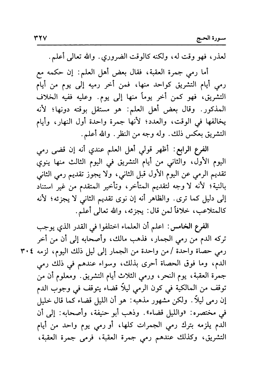 الفرع الخامس: اعلم أن العلماء اختلفوا في القدر الذي يوجب تركه الدم من رمي الجمار، فذهب مالك، وأصحابه إلى أن من أخر رمي حصاة واحدة من واحدة من الجمار إلى ليل ذلك اليوم، لزمه الدم، وما فوق الحصاة أحرى بذلك، وسواء عندهم في ذلك رمي جمرة العقبة، يوم النحر، ورمي الثلاث أيام التشريق. ومعلوم أن من توقف من المالكية في كون الرمي ليلًا قضاء يتوقف في وجوب الدم إن رمى ليلًا. ولكن مشهور مذهبه: هو أن الليل قضاء كما قال خليل في مختصره: "والليل قضاء". وذهب أبو حنيفة، وأصحابه: إلى أن الدم يلزمه بترك رمي الجمرات كلها، أو رمي يوم واحد من أيام التشريق، وكذلك عندهم رمي جمرة العقبة، فرمى جمرة العقبة،