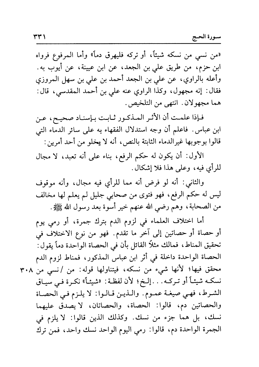 "من نسي من نسكه شيئًا، أو تركه فليهرق دمًا" وأما المرفوع فرواه ابن حزم، من طريق علي بن الجعد، عن ابن عيينة، عن أيوب به. وأعله بالراوي، عن علي بن الجعد أحمد بن علي بن سهل المروزي فقال: إنه مجهول، وكذا الراوي عنه علي بن أحمد المقدسي، قال: هما مجهولان. انتهى من التلخيص.