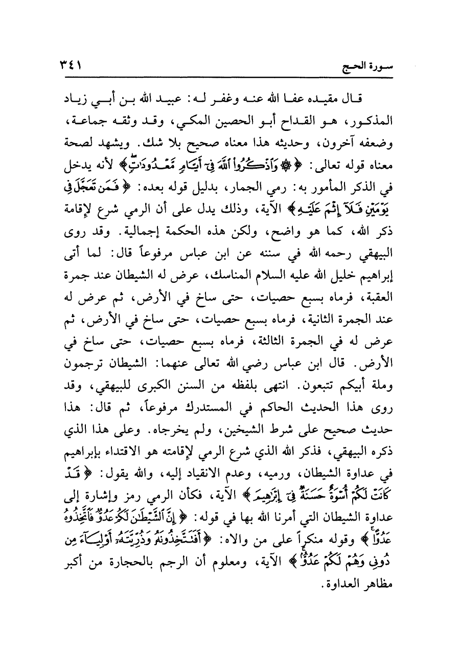 قال مقيده عفا الله عنه وغفر له: عبيد الله بن أبي زياد المذكور، هو القداح أبو الحصين المكي، وقد وثقه جماعة، وضعفه آخرون، وحديثه هذا معناه صحيح بلا شك. ويشهد لصحة معناه قوله تعالى: {وَاذْكُرُوا اللَّهَ فِي أَيَّامٍ مَعْدُودَاتٍ} لأنه يدخل في الذكر المأمور به: رمي الجمار، بدليل قوله بعده: {فَمَنْ تَعَجَّلَ فِي يَوْمَيْنِ فَلَا إِثْمَ عَلَيْهِ} الآية، وذلك يدل على أن الرمي شرع لإِقامة ذكر الله، كما هو واضح، ولكن هذه الحكمة إجمالية. وقد روى البيهقي رحمه الله في سننه عن ابن عباس مرفوعًا قال: لما أتى إبراهيم خليل الله عليه السلام المناسك، عرض له الشيطان عند جمرة العقبة، فرماه بسبع حصيات، حتى ساخ في الأرض، ثم عرض له عند الجمرة الثانية، فرماه بسبع حصيات، حتى ساخ في الأرض، ثم عرض له في الجمرة الثالثة، فرماه بسبع حصيات، حتى ساخ في الأرض. قال ابن عباس رضي الله تعالى عنهما: الشيطان ترجمون وملة أبيكم تتبعون. انتهى بلفظه من السنن الكبرى للبيهقي، وقد روى هذا الحديث الحاكم في المستدرك مرفوعًا، ثم قال: هذا حديث صحيح على شرط الشيخين، ولم يخرجاه. وعلى هذا الذي ذكره البيهقي، فذكر الله الذي شرع الرمي لإِقامته هو الاقتداء بإبراهيم في عداوة الشيطان، ورميه، وعدم الانقياد إليه، والله يقول: {قَدْ كَانَتْ لَكُمْ أُسْوَةٌ حَسَنَةٌ فِي إِبْرَاهِيمَ} الآية، فكأن الرمي رمز وإشارة إلى عداوة الشيطان التي أمرنا الله بها في قوله: {إِنَّ الشَّيْطَانَ لَكُمْ عَدُوٌّ فَاتَّخِذُوهُ عَدُوًّا} وقوله منكرًا على من والاه: {أَفَتَتَّخِذُونَهُ وَذُرِّيَّتَهُ أَوْلِيَاءَ مِنْ دُونِي وَهُمْ لَكُمْ عَدُوٌّ} الآية، ومعلوم أن الرجم بالحجارة من أكبر مظاهر العداوة.