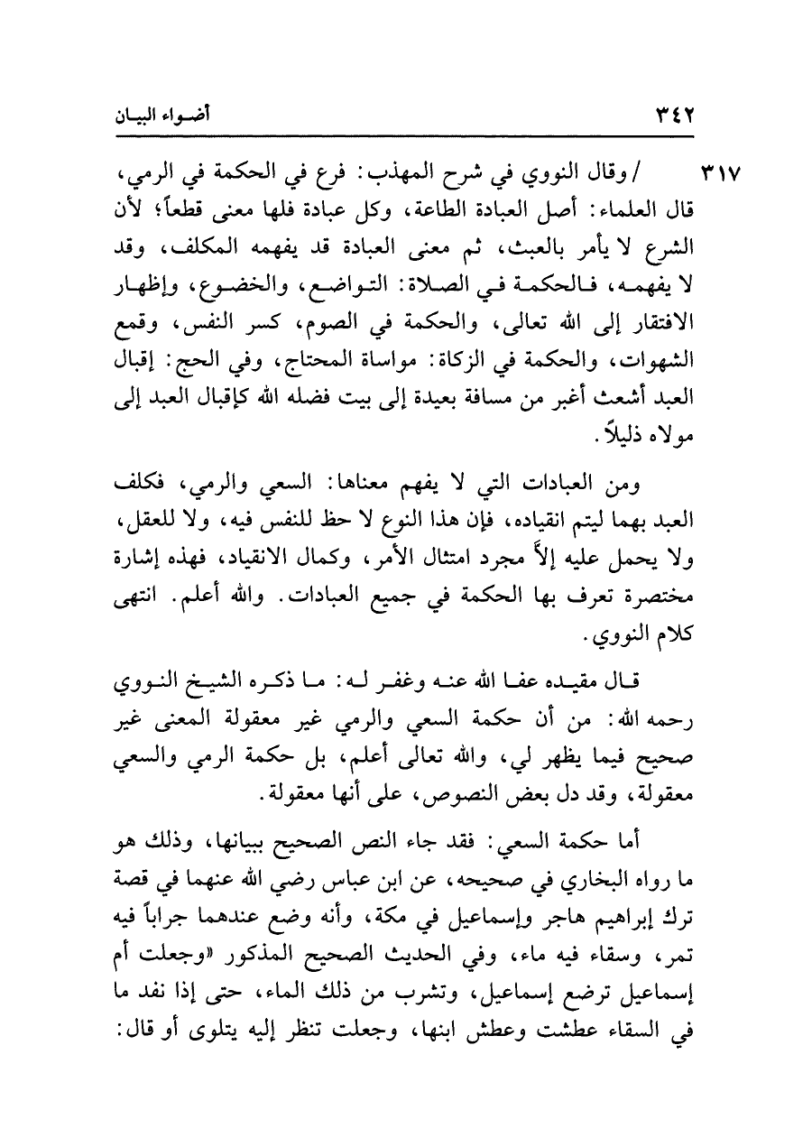 قال مقيده عفا الله عنه وغفر له: ما ذكره الشيخ النووي رحمه الله: من أن حكمة السعي والرمي غير معقولة المعنى غير صحيح فيما يظهر لي، والله تعالى أعلم، بل حكمة الرمي والسعي معقولة، وقد دل بعض النصوص، على أنها معقولة.