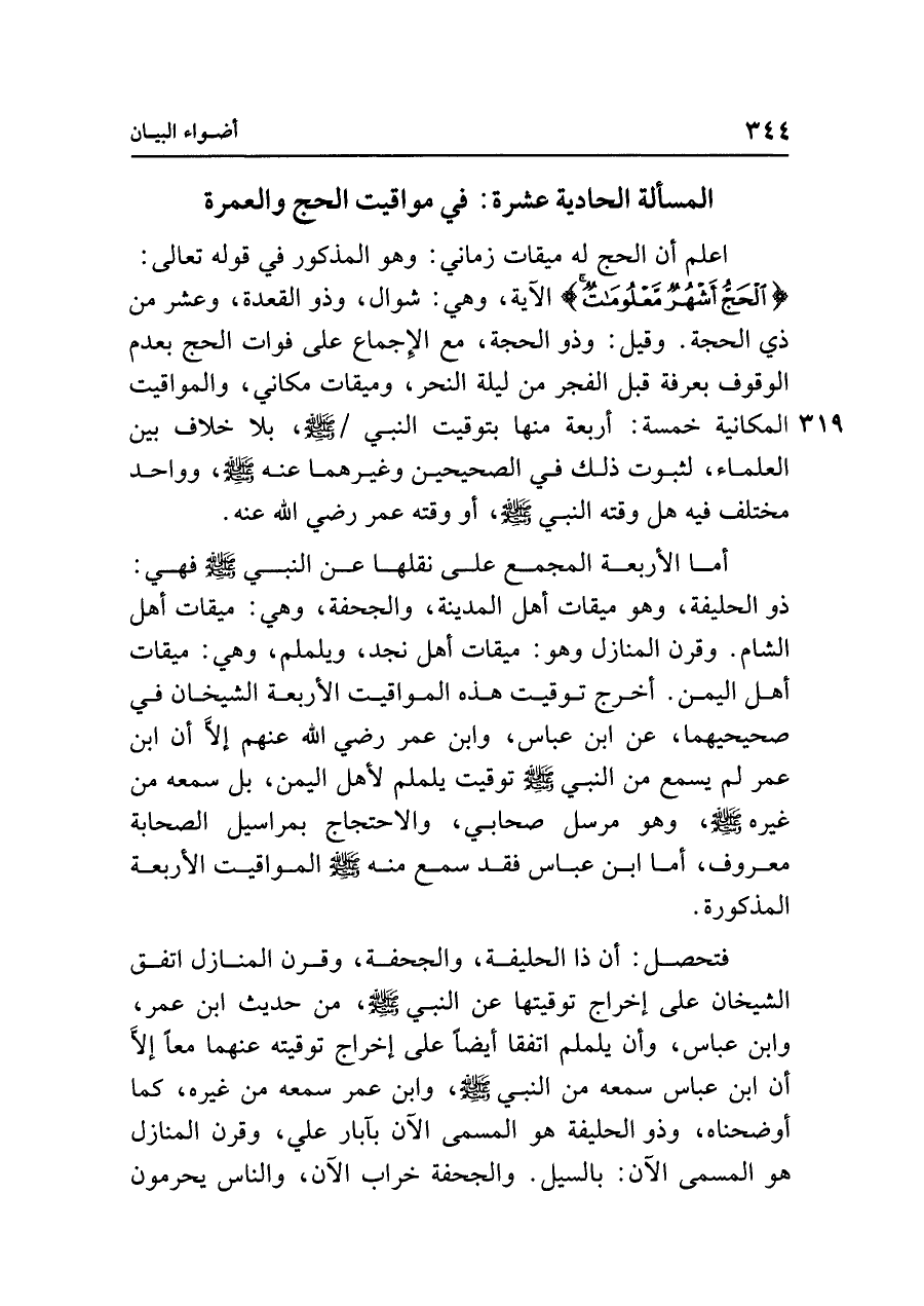 فتحصل: أن ذا الحليفة، والجحفة، وقرن المنازل اتفق الشيخان على إخراج توقيتها عن النبي - صلى الله عليه وسلم - ، من حديث ابن عمر، وابن عباس، وأن يلملم اتفقا أيضًا على إخراج توقيته عنهما معًا إلَّا أن ابن عباس سمعه من النبي - صلى الله عليه وسلم - ، وابن عمر سمعه من غيره، كما أوضحناه، وذو الحليفة هو المسمى الآن بآبار علي، وقرن المنازل هو المسمى الآن: بالسيل. والجحفة خراب الآن، والناس يحرمون