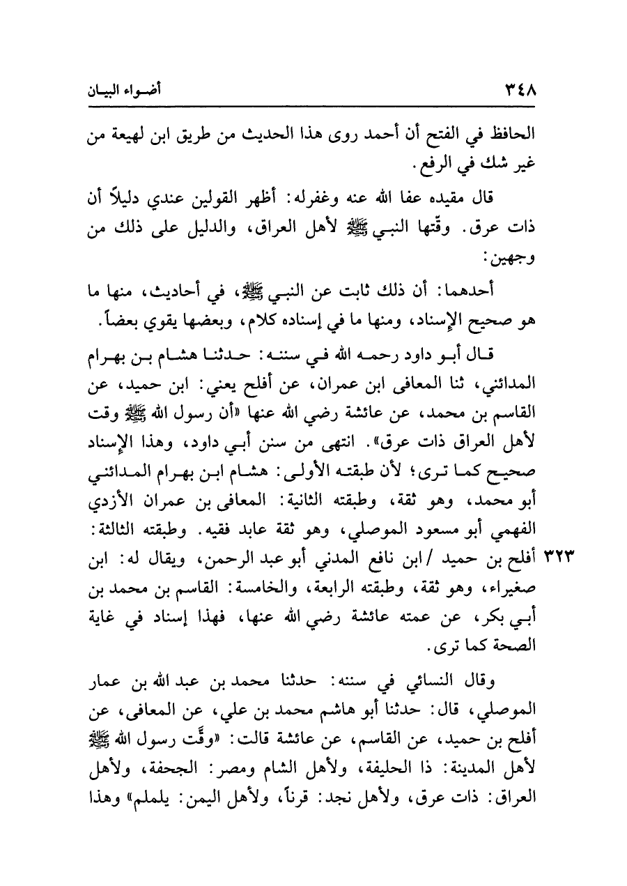 قال أبو داود رحمه الله في سننه: حدثنا هشام بن بهرام المدائني، ثنا المعافى بن عمران، عن أفلح يعني: ابن حميد، عن القاسم بن محمد، عن عائشة رضي الله عنها "أن رسول الله - صلى الله عليه وسلم - وقت لأهل العراق ذات عرق". انتهى من سنن أبي داود، وهذا الإِسناد صحيح كما ترى؛ لأن طبقته الأولى: هشام بن بهرام المدائني أبو محمد، وهو ثقة، وطبقته الثانية: المعافى بن عمران الأزدي الفهمي أبو مسعود الموصلي، وهو ثقة عابد فقيه. وطبقته الثالثة: أفلح بن حميد ابن نافع المدني أبو عبد الرحمن، ويقال له: ابن صغيراء، وهو ثقة، وطبقته الرابعة، والخامسة: القاسم بن محمد بن أبي بكر، عن عمته عائشة رضي الله عنها، فهذا إسناد في غاية الصحة كما ترى.