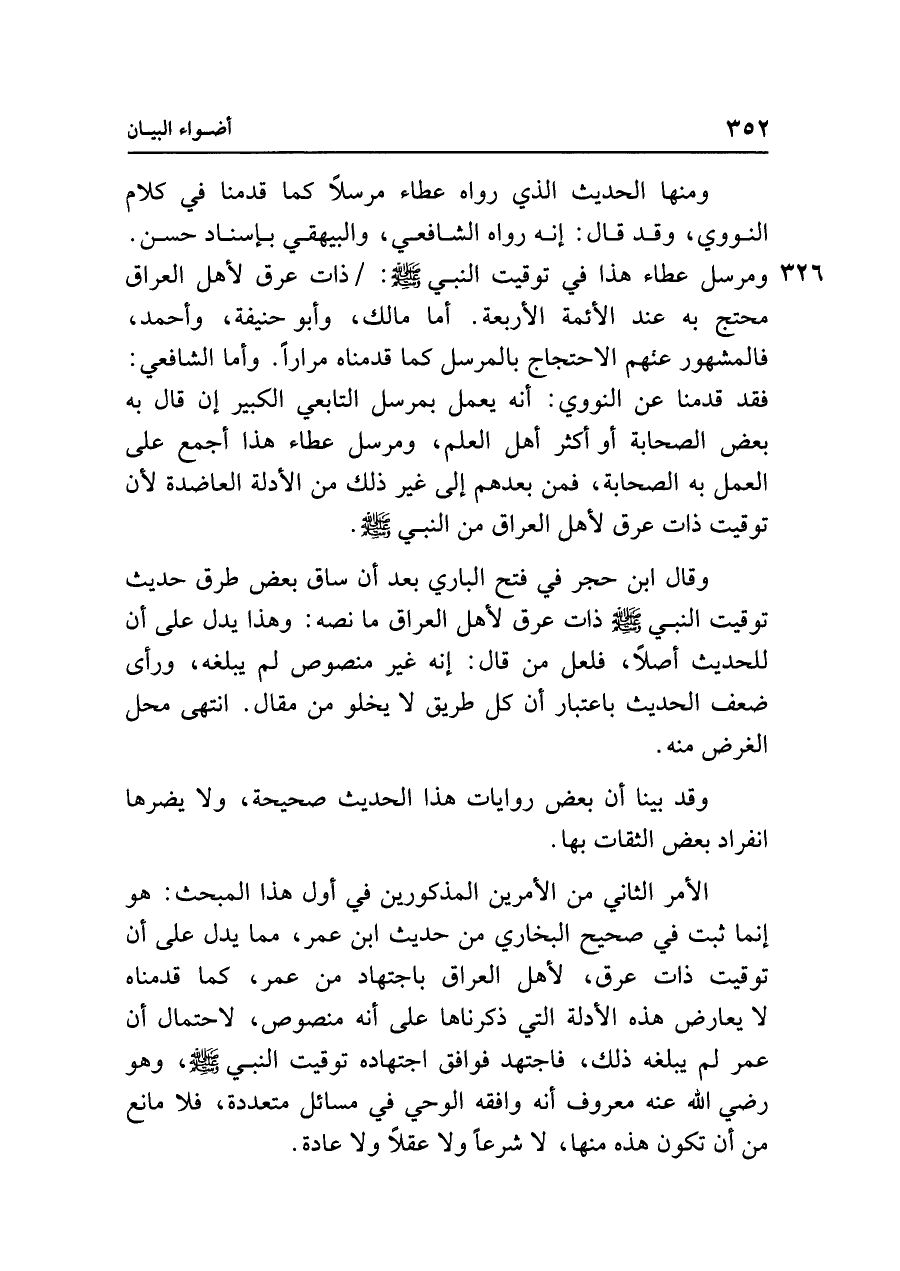 ومنها الحديث الذي رواه عطاء مرسلًا كما قدمنا في كلام النووي، وقد قال: إنه رواه الشافعي، والبيهقي بإسناد حسن. ومرسل عطاء هذا في توقيت النبي - صلى الله عليه وسلم - : ذات عرق لأهل العراق محتج به عند الأئمة الأربعة. أما مالك، وأبو حنيفة، وأحمد، فالمشهور عنهم الاحتجاج بالمرسل كما قدمناه مرارًا. وأما الشافعي: فقد قدمنا عن النووي: أنه يعمل بمرسل التابعي الكبير إن قال به بعض الصحابة أو أكثر أهل العلم، ومرسل عطاء هذا أجمع على العمل به الصحابة، فمن بعدهم إلى غير ذلك من الأدلة العاضدة لأن توقيت ذات عرق لأهل العراق من النبي - صلى الله عليه وسلم - .