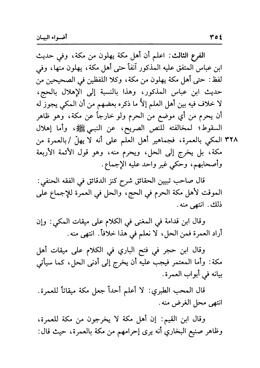 الفرع الثالث: اعلم أن أهل مكة يهلون من مكة، وفي حديث ابن عباس المتفق عليه المذكور آنفًا حتى أهل مكة، يهلون منها، وفي لفظ: حتى أهل مكة يهلون من مكة، وكلا اللفظين في الصحيحين من حديث ابن عباس المذكور، وهذا بالنسبة إلى الإِهلال بالحج، لا خلاف فيه بين أهل العلم إلَّا ما ذكره بعضهم من أن المكي يجوز له أن يحرم من أي موضع من الحرم ولو خارجًا عن مكة، وهو ظاهر السقوط؛ لمخالفته للنص الصريح، عن النبي - صلى الله عليه وسلم - ، وأما إهلال المكي بالعمرة، فجماهير أهل العلم على أنه لا يهلّ بالعمرة من مكة، بل يخرج إلى الحل، ويحرم منه، وهو قول الأئمة الأربعة وأصحابهم، وحكي غير واحد عليه الإِجماع.