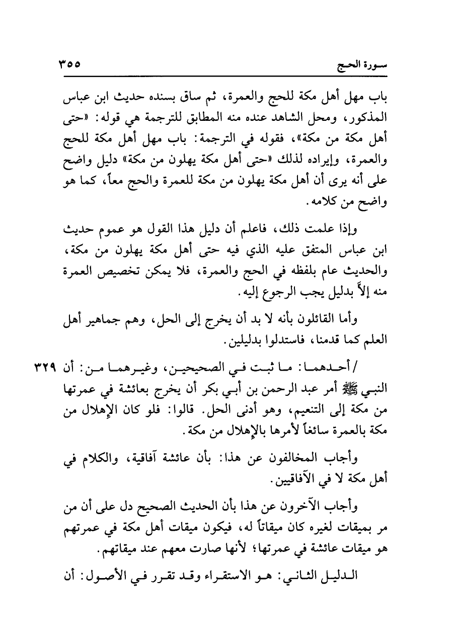 وإذا علمت ذلك، فاعلم أن دليل هذا القول هو عموم حديث ابن عباس المتفق عليه الذي فيه حتى أهل مكة يهلون من مكة، والحديث عام بلفظه في الحج والعمرة، فلا يمكن تخصيص العمرة منه إلَّا بدليل يجب الرجوع إليه.