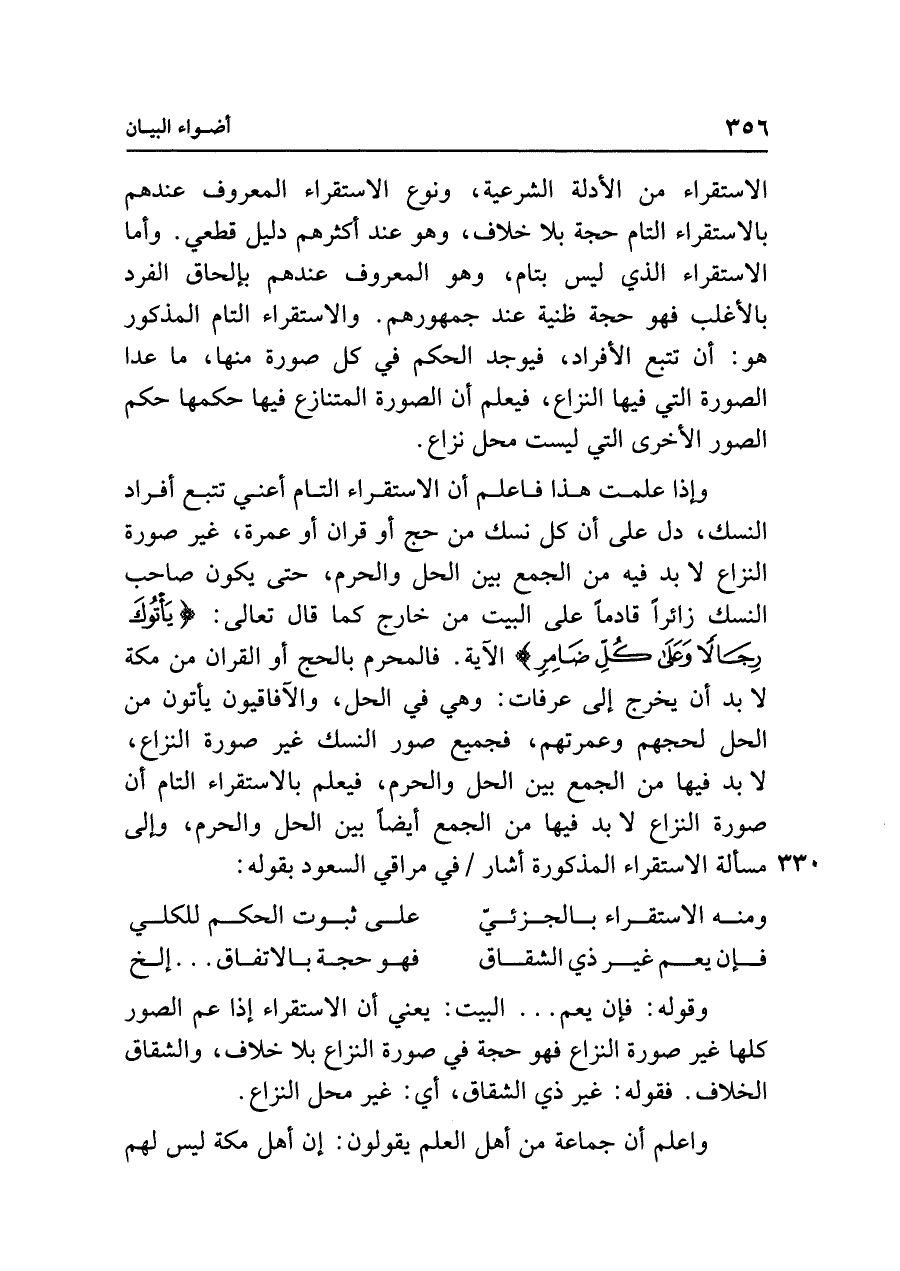 وإذا علمت هذا فاعلم أن الاستقراء التام أعني تتبع أفراد النسك، دل على أن كل نسك من حج أو قران أو عمرة، غير صورة النزاع لا بد فيه من الجمع بين الحل والحرم، حتى يكون صاحب النسك زائرًا قادمًا على البيت من خارج كما قال تعالى: {يَأْتُوكَ رِجَالًا وَعَلَى كُلِّ ضَامِرٍ} الآية. فالمحرم بالحج أو القران من مكة لا بد أن يخرج إلى عرفات: وهي في الحل، والآفاقيون يأتون من الحل لحجهم وعمرتهم، فجميع صور النسك غير صورة النزاع، لا بد فيها من الجمع بين الحل والحرم، فيعلم بالاستقراء التام أن صورة النزاع لا بد فيها من الجمع أيضًا بين الحل والحرم، وإلى مسألة الاستقراء المذكورة أشار في مراقي السعود بقوله: