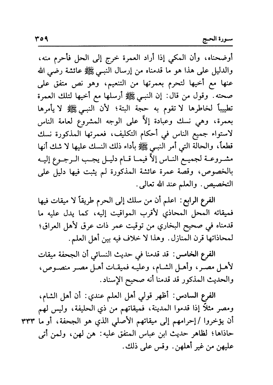الفرع السادس: أظهر قولي أهل العلم عندي: أن أهل الشام، ومصر مثلًا إذا قدموا المدينة، فميقاتهم من ذي الحليفة، وليس لهم أن يؤخروا إحرامهم إلى ميقاتهم الأصلي الذي هو الجحفة، أو ما حاذاها، لظاهر حديث ابن عباس المتفق عليه: هن لهن، ولمن أتى عليهن من غير أهلهن. وقس على ذلك.