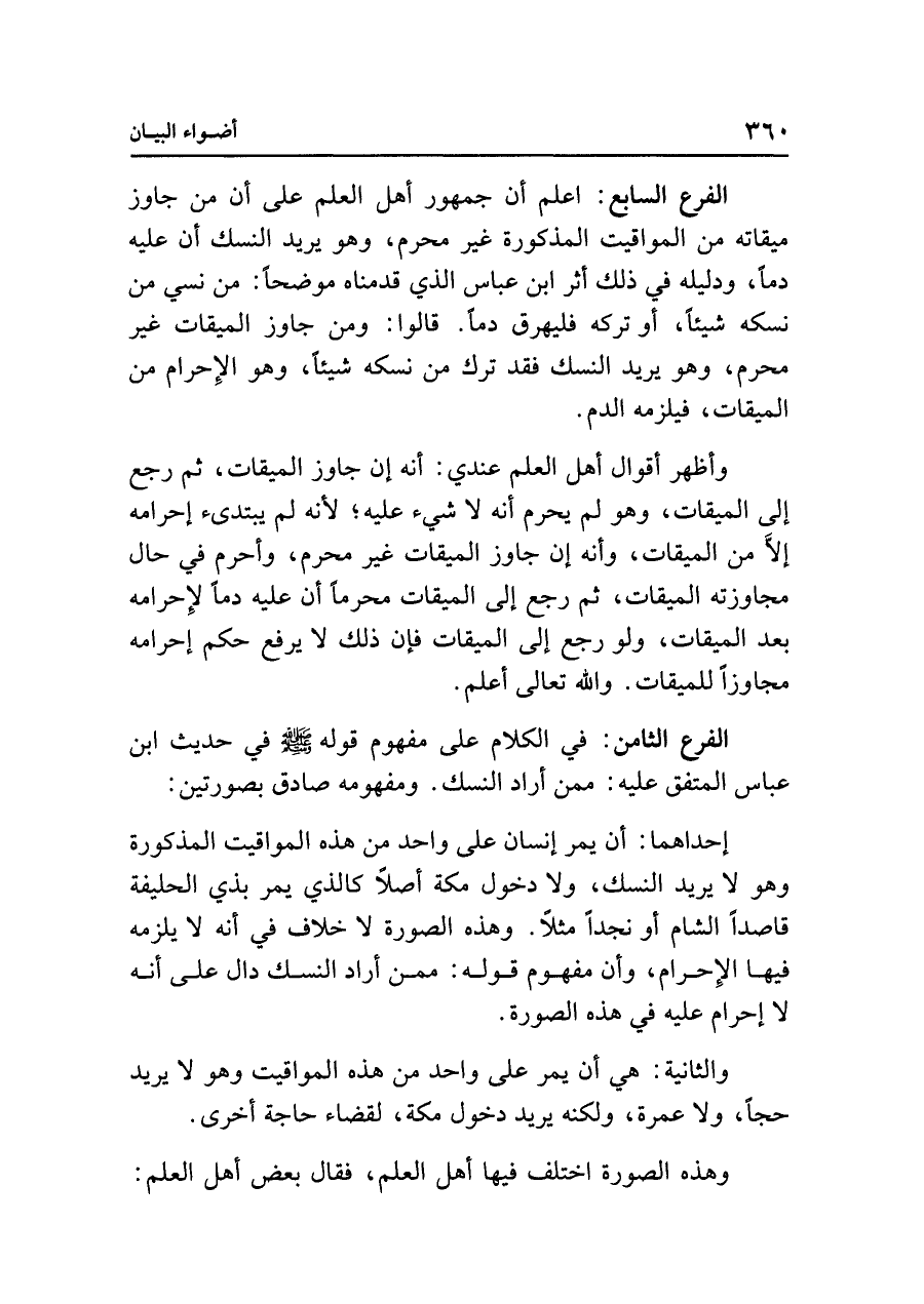 الفرع السابع: اعلم أن جمهور أهل العلم على أن من جاوز ميقاته من المواقيت المذكورة غير محرم، وهو يريد النسك أن عليه دمًا، ودليله في ذلك أثر ابن عباس الذي قدمناه موضحًا: من نسي من نسكه شيئًا، أو تركه فليهرق دمًا. قالوا: ومن جاوز الميقات غير محرم، وهو يريد النسك فقد ترك من نسكه شيئًا، وهو الإحرام من الميقات، فيلزمه الدم.