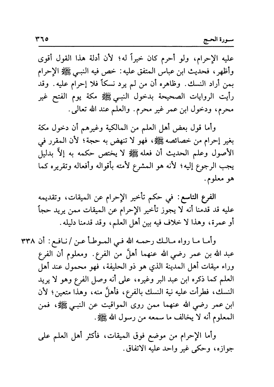 وأما ما رواه مالك رحمه الله في الموطأ عن نافع: أن عبد الله بن عمر رضي الله عنهما أهل من الفرع. ومعلوم أن الفرع وراء ميقات أهل المدينة الذي هو ذو الحليفة، فهو محمول عند أهل العلم كما ذكره ابن عبد البر وغيره، على أنه وصل الفرع وهو لا يريد النسك، فطرأت عليه نية النسك بالفرع، فأهلَّ منه، وهذا متعين؛ لأن ابن عمر رضي الله عنهما ممن روى المواقيت عن النبي - صلى الله عليه وسلم - ، فمن المعلوم أنه لا يخالف ما سمعه من رسول الله - صلى الله عليه وسلم - .