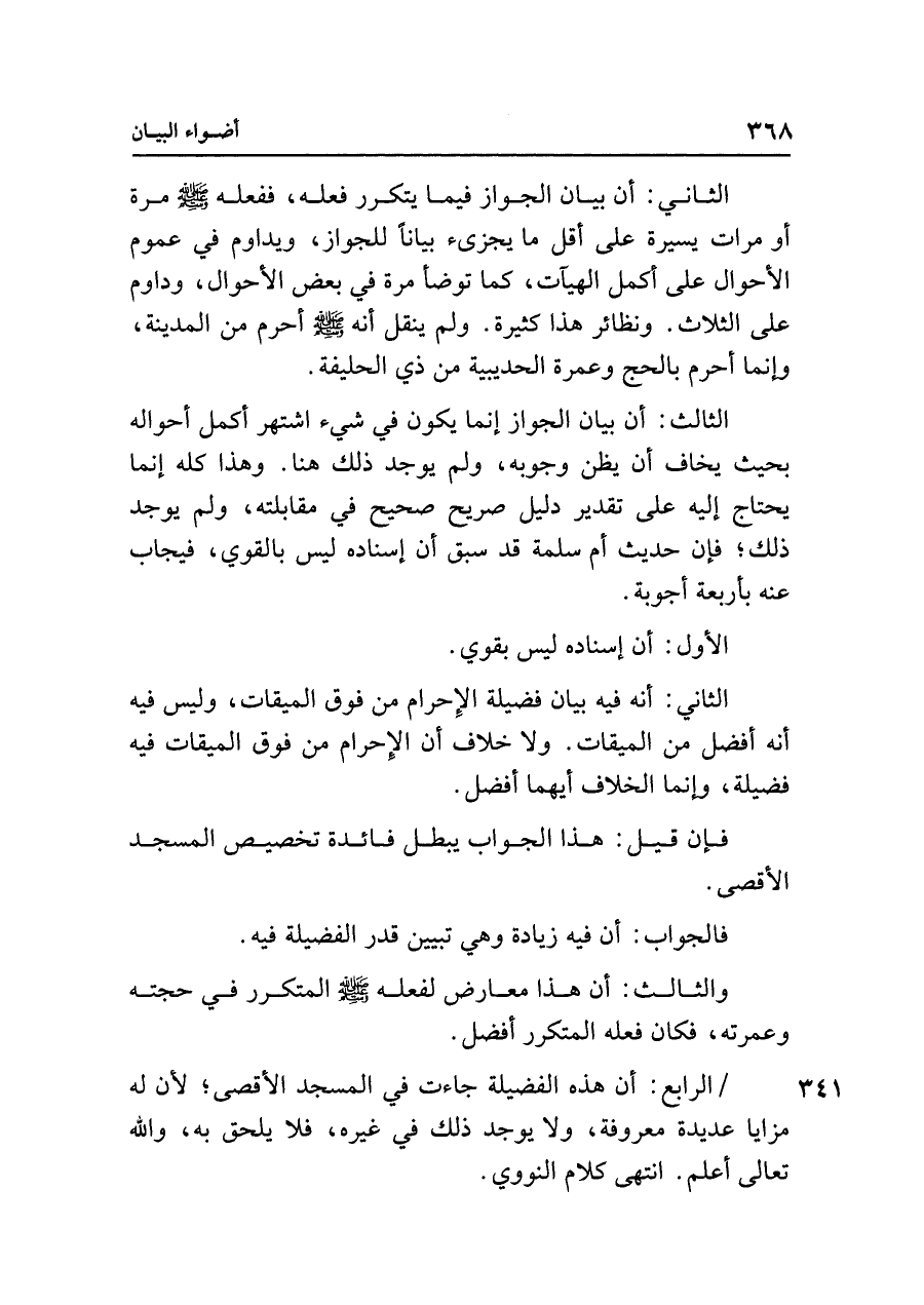 الثاني: أن بيان الجواز فيما يتكرر فعله، ففعله - صلى الله عليه وسلم - مرة أو مرات يسيرة على أقل ما يجزئ بيانًا للجواز، ويداوم في عموم الأحوال على أكمل الهيآت، كما توضأ مرة في بعض الأحوال، وداوم على الثلاث. ونظائر هذا كثيرة. ولم ينقل أنه - صلى الله عليه وسلم - أحرم من المدينة، وإنما أحرم بالحج وعمرة الحديبية من ذي الحليفة.