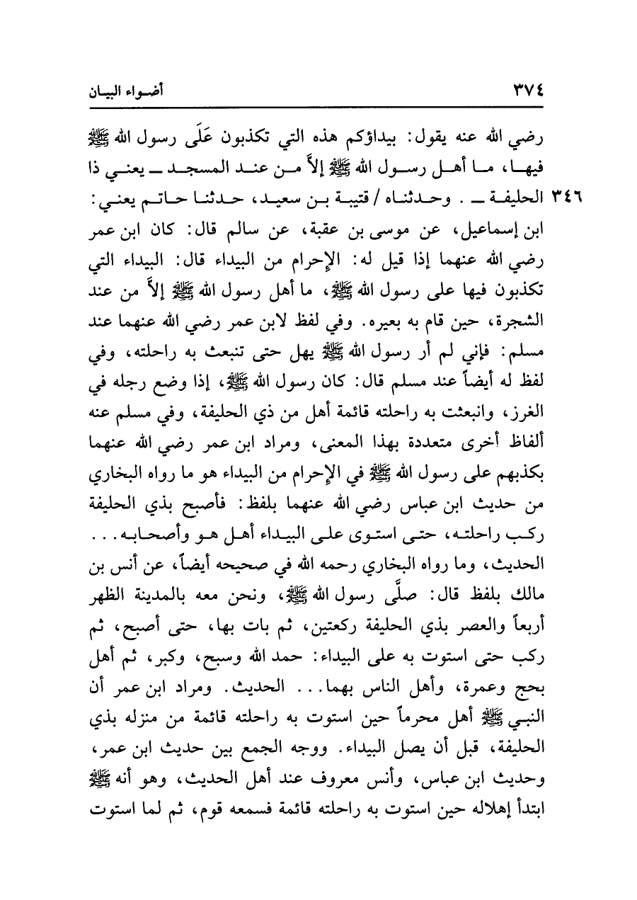 رضي الله عنه يقول: بيداؤكم هذه التي تكذبون عَلَى رسول الله - صلى الله عليه وسلم - فيها، ما أهل رسول الله - صلى الله عليه وسلم - إلَّا من عند المسجد - يعني ذا الحليفة - . وحدثناه قتيبة بن سعيد، حدثنا حاتم يعني: ابن إسماعيل، عن موسى بن عقبة، عن سالم قال: كان ابن عمر رضي الله عنهما إذا قيل له: الإِحرام من البيداء قال: البيداء التي تكذبون فيها على رسول الله - صلى الله عليه وسلم - ، ما أهل رسول الله - صلى الله عليه وسلم - إلَّا من عند الشجرة، حين قام به بعيره. وفي لفظ لابن عمر رضي الله عنهما عند مسلم: فإني لم أر رسول الله - صلى الله عليه وسلم - يهل حتى تنبعث به راحلته، وفي لفظ له أيضًا عند مسلم قال: كان رسول الله - صلى الله عليه وسلم - ، إذا وضع رجله في الغرز، وانبعثت به راحلته قائمة أهل من ذي الحليفة، وفي مسلم عنه ألفاظ أخرى متعددة بهذا المعنى، ومراد ابن عمر رضي الله عنهما بكذبهم على رسول الله - صلى الله عليه وسلم - في الإِحرام من البيداء هو ما رواه البخاري من حديث ابن عباس رضي الله عنهما بلفظ: فأصبح بذي الحليفة ركب راحلته، حتى استوى على البيداء أهل هو وأصحابه. . . الحديث، وما رواه البخاري رحمه الله في صحيحه أيضًا، عن أنس بن مالك بلفظ قال: صلَّى رسول الله - صلى الله عليه وسلم - ، ونحن معه بالمدينة الظهر أربعًا والعصر بذي الحليفة ركعتين، ثم بات بها، حتى أصبح، ثم ركب حتى استوت به على البيداء: حمد الله وسبح، وكبر، ثم أهل بحج وعمرة، وأهل الناس بهما. . . الحديث. ومراد ابن عمر أن النبي - صلى الله عليه وسلم - أهل محرمًا حين استوت به راحلته قائمة من منزله بذي الحليفة، قبل أن يصل البيداء. ووجه الجمع بين حديث ابن عمر، وحديث ابن عباس، وأنس معروف عند أهل الحديث، وهو أنه - صلى الله عليه وسلم - ابتدأ إهلاله حين استوت به راحلته قائمة فسمعه قوم، ثم لما استوت