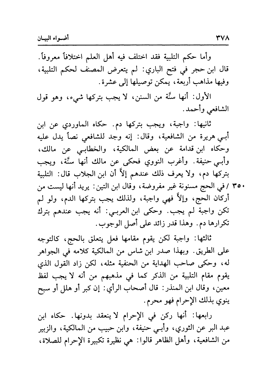 ثانيها: واجبة، ويجب بتركها دم. حكاه الماوردي عن ابن أبي هريرة من الشافعية، وقال: إنه وجد للشافعي نصًا يدل عليه وحكاه ابن قدامة عن بعض المالكية، والخطابي عن مالك، وأبي حنيفة. وأغرب النووي فحكى عن مالك أنها سنَّة، ويجب بتركها دم، ولا يعرف ذلك عندهم إلَّا أن ابن الجلاب قال: التلبية في الحج مسنونة غير مفروضة، وقال ابن التين: يريد أنها ليست من أركان الحج، وإلَّا فهي واجبة، ولذلك يجب بتركها الدم، ولو لم تكن واجبة لم يجب. وحكى ابن العربي: أنه يجب عندهم بترك تكرارها دم. وهذا قدر زائد على أصل الوجوب.