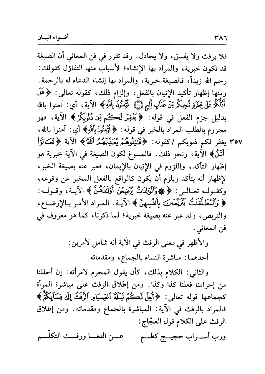 فلا يرفث ولا يفسق، ولا يجادل. وقد تقرر في فن المعاني أن الصيغة قد تكون خبرية، والمراد بها الإِنشاء؛ لأسباب منها التفاؤل كقولك: رحم الله زيدًا، فالصيغة خبرية، والمراد بها إنشاء الدعاء له بالرحمة. ومنها إظهار تأكيد الإِتيان بالفعل، وإلزام ذلك، كقوله تعالى: {هَلْ أَدُلُّكُمْ عَلَى تِجَارَةٍ تُنْجِيكُمْ مِنْ عَذَابٍ أَلِيمٍ (١٠) تُؤْمِنُونَ بِاللَّهِ} الآية، أي: آمنوا باللَّه بدليل جزم الفعل في قوله: {يَغْفِرْ لَكُمْ مِنْ ذُنُوبِكُمْ} الآية، فهو مجزوم بالطلب المراد بالخبر في قوله: {تُؤْمِنُونَ بِاللَّهِ} أي: آمنوا باللَّه، يغفر لكم ذنوبكم كقوله: {قَاتِلُوهُمْ يُعَذِّبْهُمُ اللَّهُ} الآية {تَعَالَوْا أَتْلُ} الآية، ونحو ذلك. فالمسوغ لكون الصيغة في الآية خبرية هو إظهار التأكد، واللزوم في الإِتيان بالإِيمان، فعبر عنه بصيغة الخبر، لإِظهار أنه يتأكد ويلزم أن يكون كالواقع بالفعل المخبر عن وقوعه، وكقوله تعالى: {وَالْوَالِدَاتُ يُرْضِعْنَ أَوْلَادَهُنَّ} الآية، وقوله: {وَالْمُطَلَّقَاتُ يَتَرَبَّصْنَ بِأَنْفُسِهِنَّ} الآية. المراد الأمر بالإِرضاع، والتربص، وقد عبر عنه بصيغة خبرية؛ لما ذكرنا، كما هو معروف في فن المعاني.