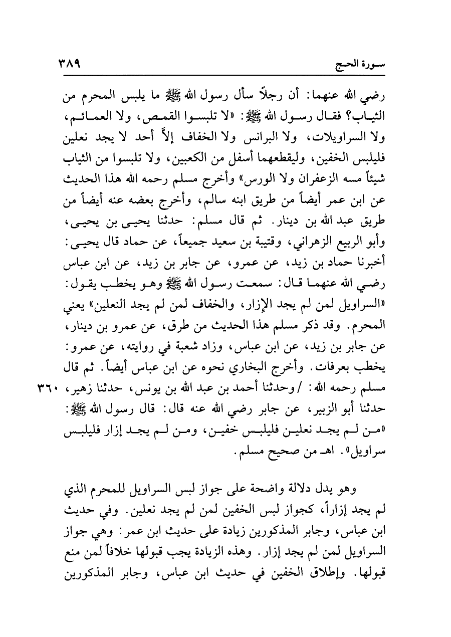 رضي الله عنهما: أن رجلًا سأل رسول الله - صلى الله عليه وسلم - ما يلبس المحرم من الثياب؛ فقال رسول الله - صلى الله عليه وسلم - : "لا تلبسوا القمص، ولا العمائم، ولا السراويلات، ولا البرانس ولا الخفاف إلَّا أحد لا يجد نعلين فليلبس الخفين، وليقطعهما أسفل من الكعبين، ولا تلبسوا من الثياب شيئًا مسه الزعفران ولا الورس" وأخرج مسلم رحمه الله هذا الحديث عن ابن عمر أيضًا من طريق ابنه سالم، وأخرج بعضه عنه أيضًا من طريق عبد الله بن دينار. ثم قال مسلم: حدثنا يحيى بن يحيى، وأبو الربيع الزهراني، وقتيبة بن سعيد جميعًا، عن حماد قال يحيى: أخبرنا حماد بن زيد، عن عمرو، عن جابر بن زيد، عن ابن عباس رضي الله عنهما قال: سمعت رسول الله - صلى الله عليه وسلم - وهو يخطب يقول: "السراويل لمن لم يجد الإِزار، والخفاف لمن لم يجد النعلين" يعني المحرم. وقد ذكر مسلم هذا الحديث من طرق، عن عمرو بن دينار، عن جابر بن زيد، عن ابن عباس، وزاد شعبة في روايته، عن عمرو: يخطب بعرفات. وأخرج البخاري نحوه عن ابن عباس أيضًا. ثم قال مسلم رحمه الله: وحدثنا أحمد بن عبد الله بن يونس، حدثنا زهير، حدثنا أبو الزبير، عن جابر رضي الله عنه قال: قال رسول الله - صلى الله عليه وسلم - : "من لم يجد نعلين فليلبس خفين، ومن لم يجد إزار فليلبس سراويل". اهـ من صحيح مسلم.