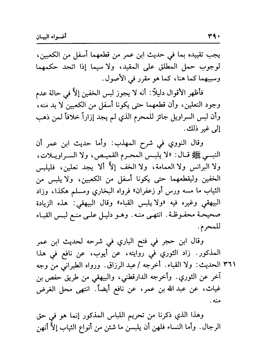 وقال ابن حجر في فتح الباري في شرحه لحديث ابن عمر المذكور. زاد الثوري في روايته، عن أيوب، عن نافع في هذا الحديث: ولا القباء. أخرجه عبد الرزاق. ورواه الطبراني من وجه آخر عن الثوري. وأخرجه الدارقطني، والبيهقي من طريق حفص بن غياث، عن عبد الله بن عمر، عن نافع أيضًا. انتهى محل الغرض منه.