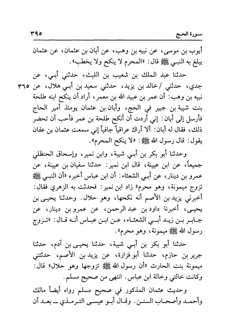 حدثنا عبد الملك بن شعيب بن الليث، حدثني أبي، عن جدي، حدثني خالد بن يزيد، حدثني سعيد بن أبي هلال، عن نبيه بن وهب: أن عمر بن عبيد الله بن معمر، أراد أن ينكح ابنه طلحة بنت شيبة بن جبير في الحج، وأبان بن عثمان يومئذ أمير الحاج فأرسل إلى أبان: إني أردت أن أنكح طلحة بن عمر فأحب أن تحضر ذلك، فقال له أبان: ألا أراك عراقيًا جافيًا إني سمعت عثمان بن عفان يقول: قال رسول الله - صلى الله عليه وسلم - : "لا ينكح المحرم".
